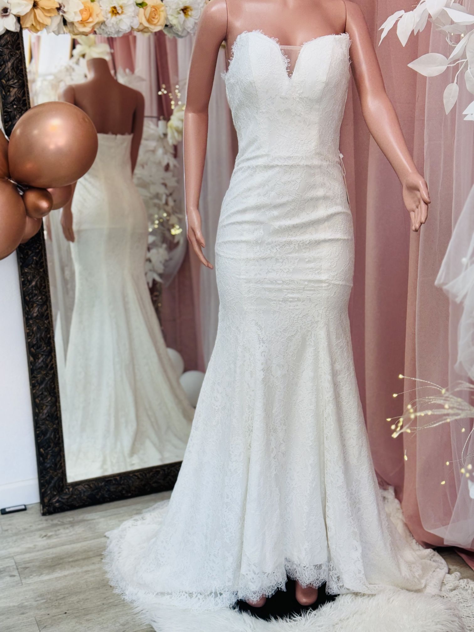 Beautiful strapless gown with intricate lace detailing Size: US 8