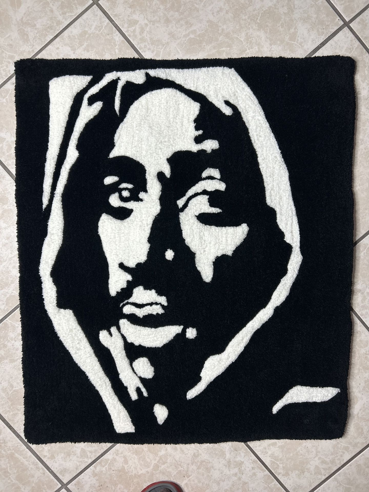 Elevate your space with this striking, one-of-a-kind handmade tufted rug featuring a powerful portrait of the legendary Tupac Shakur. Crafted using a specialized tufting technique, this rug translates a graphic black and white image of the hip-hop icon into a soft, plush floor art piece.