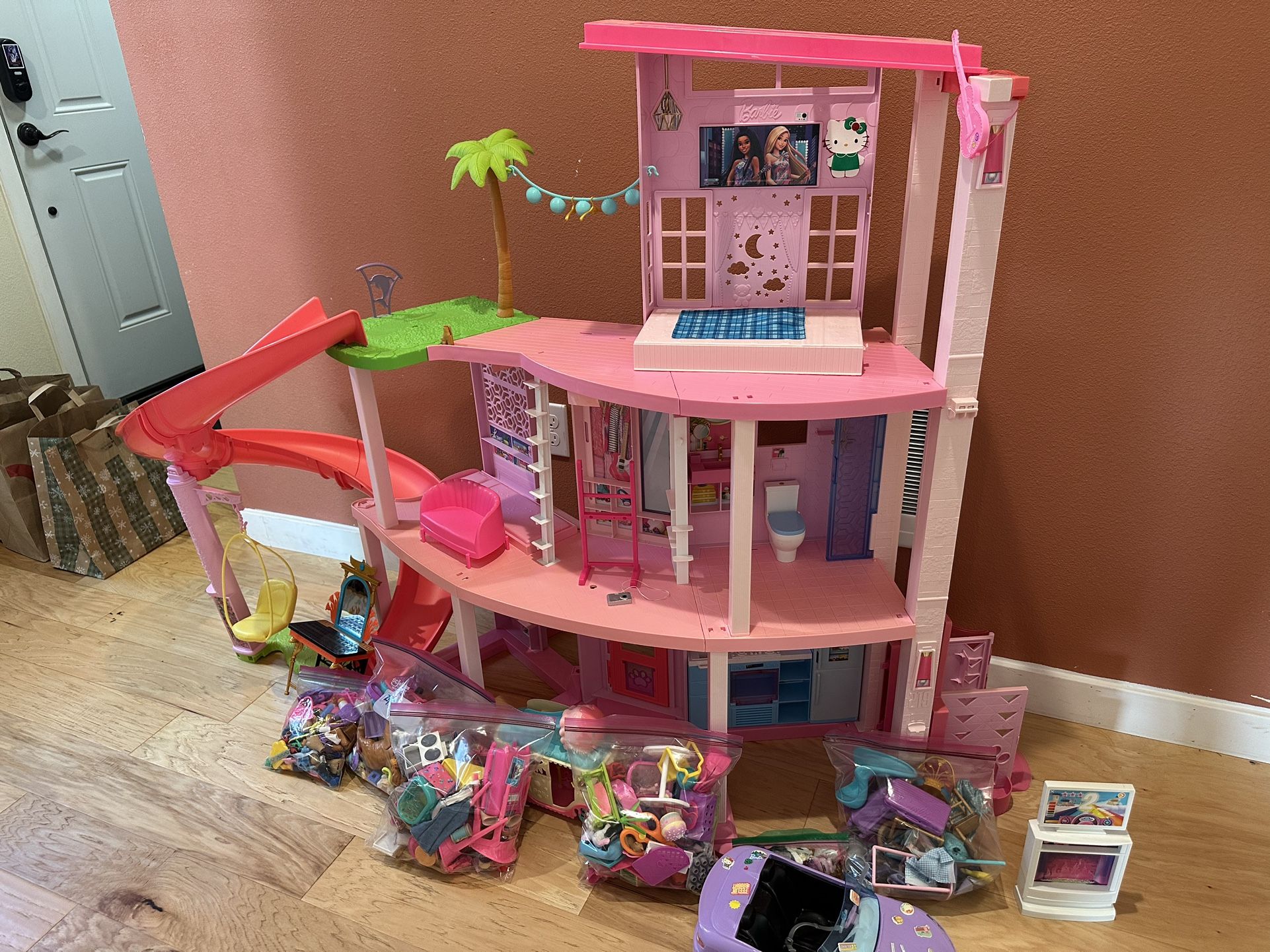 Everything works and looks like new(elevator goes up/down, toilet flushes etc). It has all the accessories it originally came with. Also including Barbie convertible, and 6 bags of an assortment of little toys and accessories. The bags have Barbie clothes, telescope, shoes, etc, Polly pocket pets, and random toys our daughter is ready to part with. Transform your kid’s holiday in one go! Price is what it is, because the house itself costs 200$ right now at Freddie’s, and there are a bunch of extras that easily add up to over 100$. Happy Holidays.