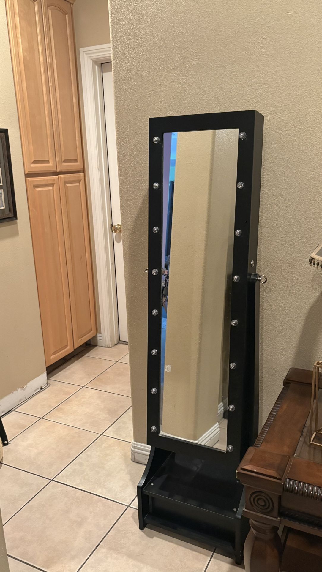 Full length mirror with LED lights. The mirror opens and has a lot of space for jewelry and other items. The bottom has a drawer for more storage!
