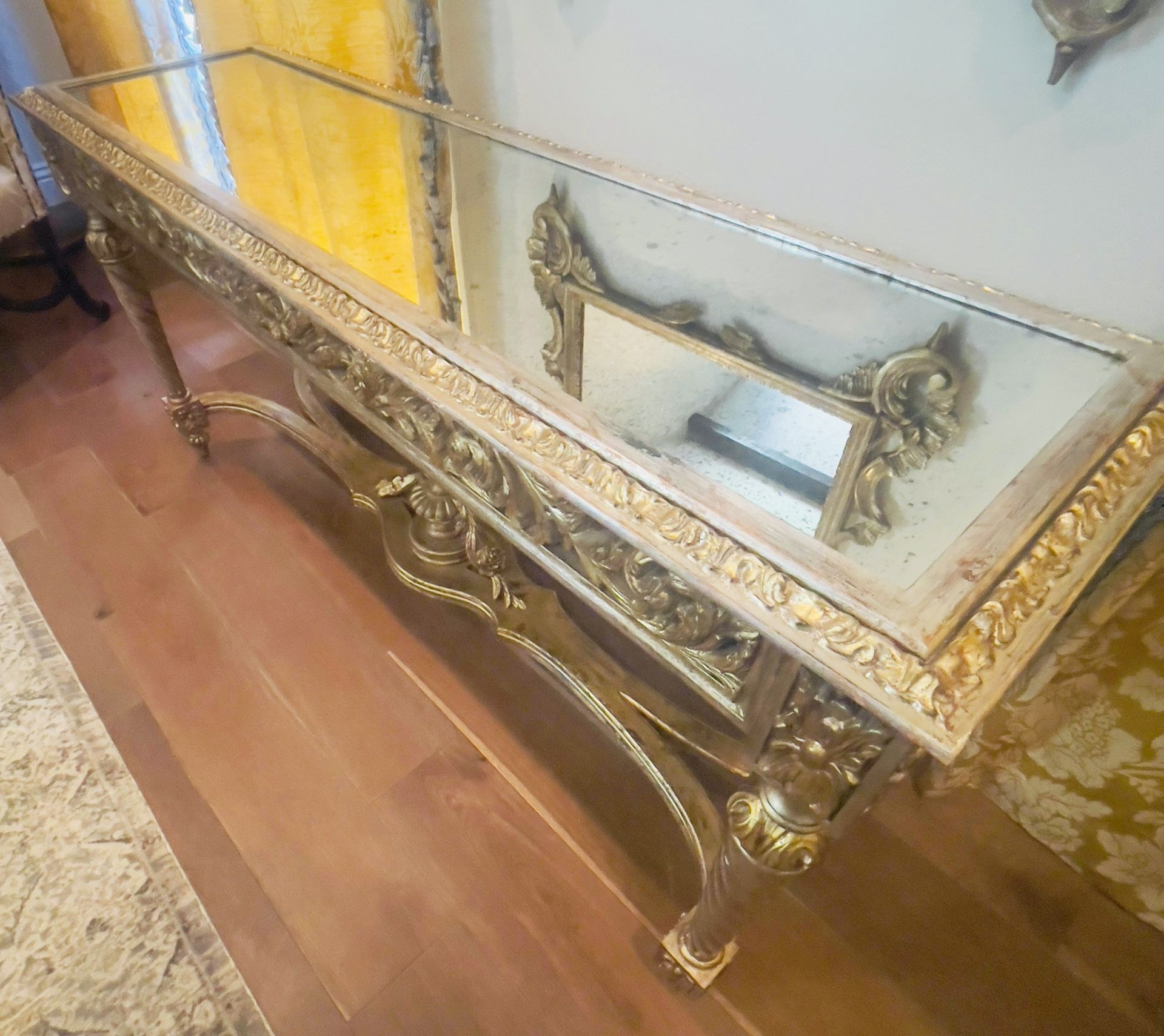 Custom-made sofa table with mirrored top Originally purchased from Drexel heritage Antique silver and gold ornate wood, carvings, and beautiful turned legs Distressed finish, scratches and scuffs, solid and sturdy May consider selling separately Sofa table 19 x 69” 31”H Matching coffee table is also available Please see additional listing Delivery not available Pick up only in Riverside