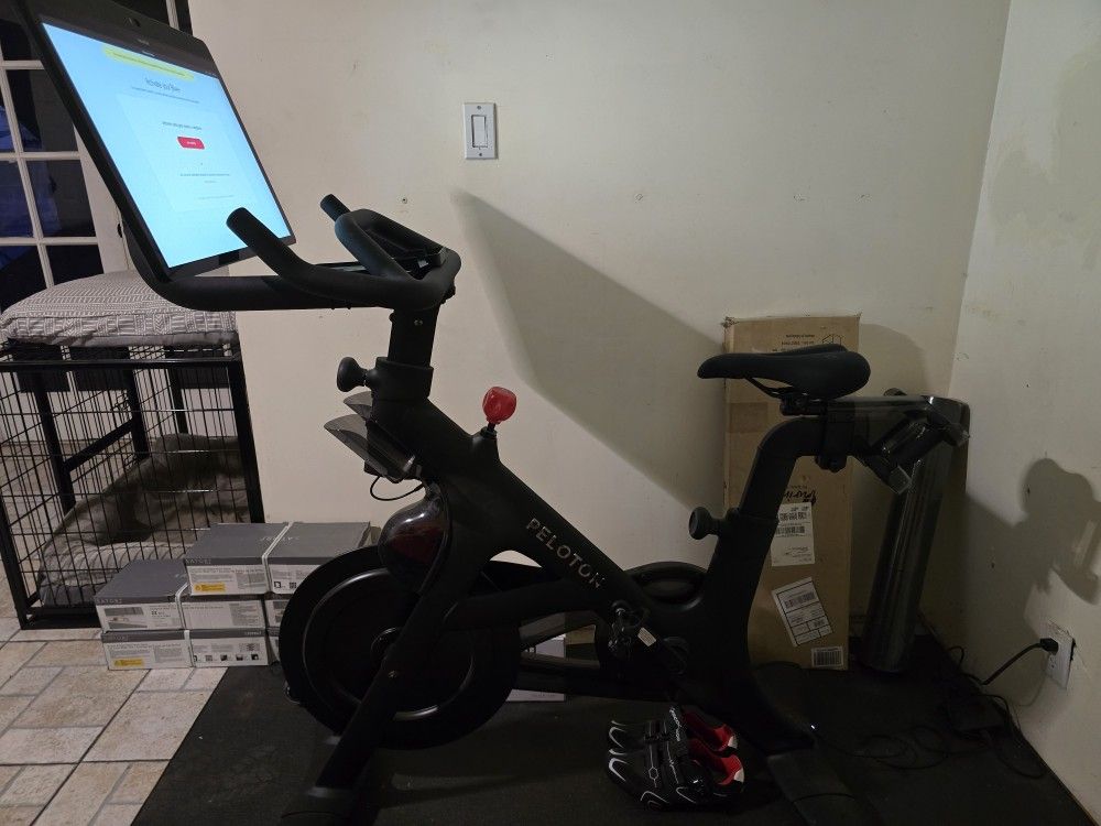 Like new peleton bike plus 3rd gen 22inch touchscreen. Comes with women's size 7 shoes and men's size 8 Also includes weights, mats and bands Used only a handful of times