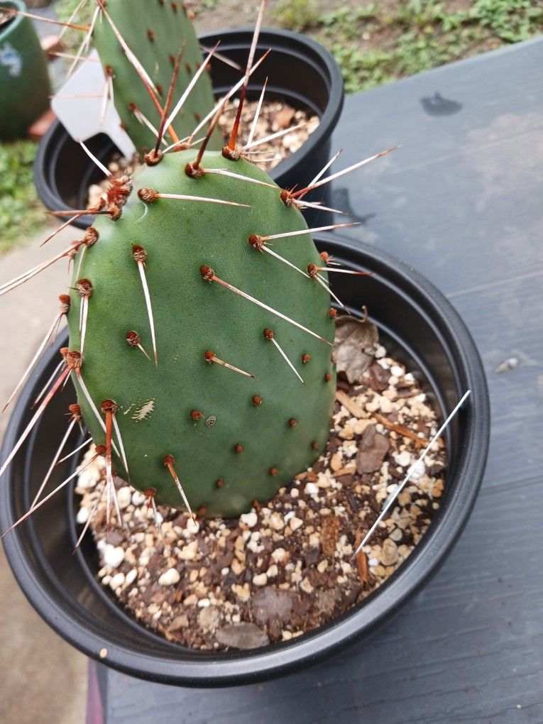 These are cold, hardy, prickly pears with red flowers in the summer. Doesn't get very tall but does get bushy with barbed spines. Desert skies opuntia