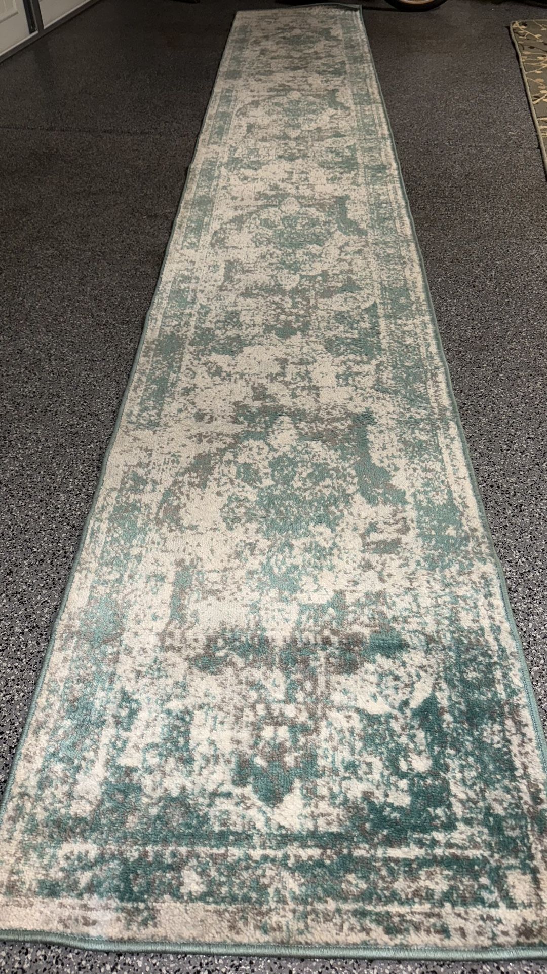Close to 13ft long, 2ft wide runner rug. has no rips no tears no fraying, the obvious discoloring from wear and use. it just needs a good cleaning throughout as shown in the pictures you could see the dirt coming up through. clean it couple more times and It will look brand new. I only did two run throughs with my carpet cleaner and already you could see the difference. it is a bit time-consuming, so selling it as is washed twice if you want to do it a couple more times you can .