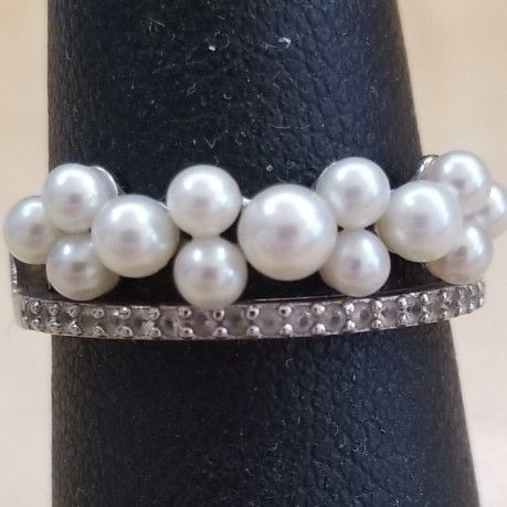 Sterling silver ring set with coultured pearls and small round glass stones. Is a sz.6 and weighs approx 2.5grams total weight.