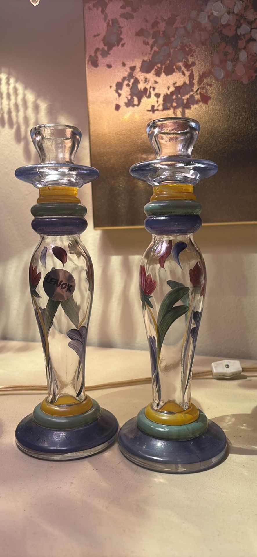 Beautiful hand painted Lenox candlesticks made in Italy. 10” tall. Poppies on Blue