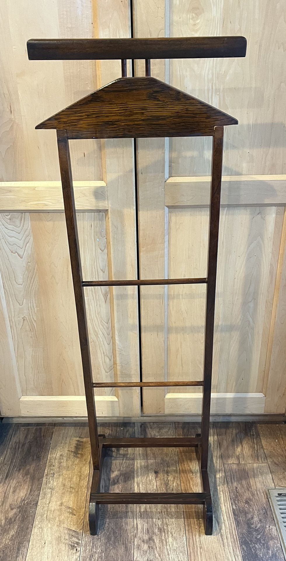 This functional solid hardwood Gentleman's Clothes Valet Stand features a sculptured wood hanger, ideal for a jacket or shirt, pants hanger, or ties. Beautiful vintage collectors piece! Dimensions 46"h 12.5"w 12.5"d W Bloomington