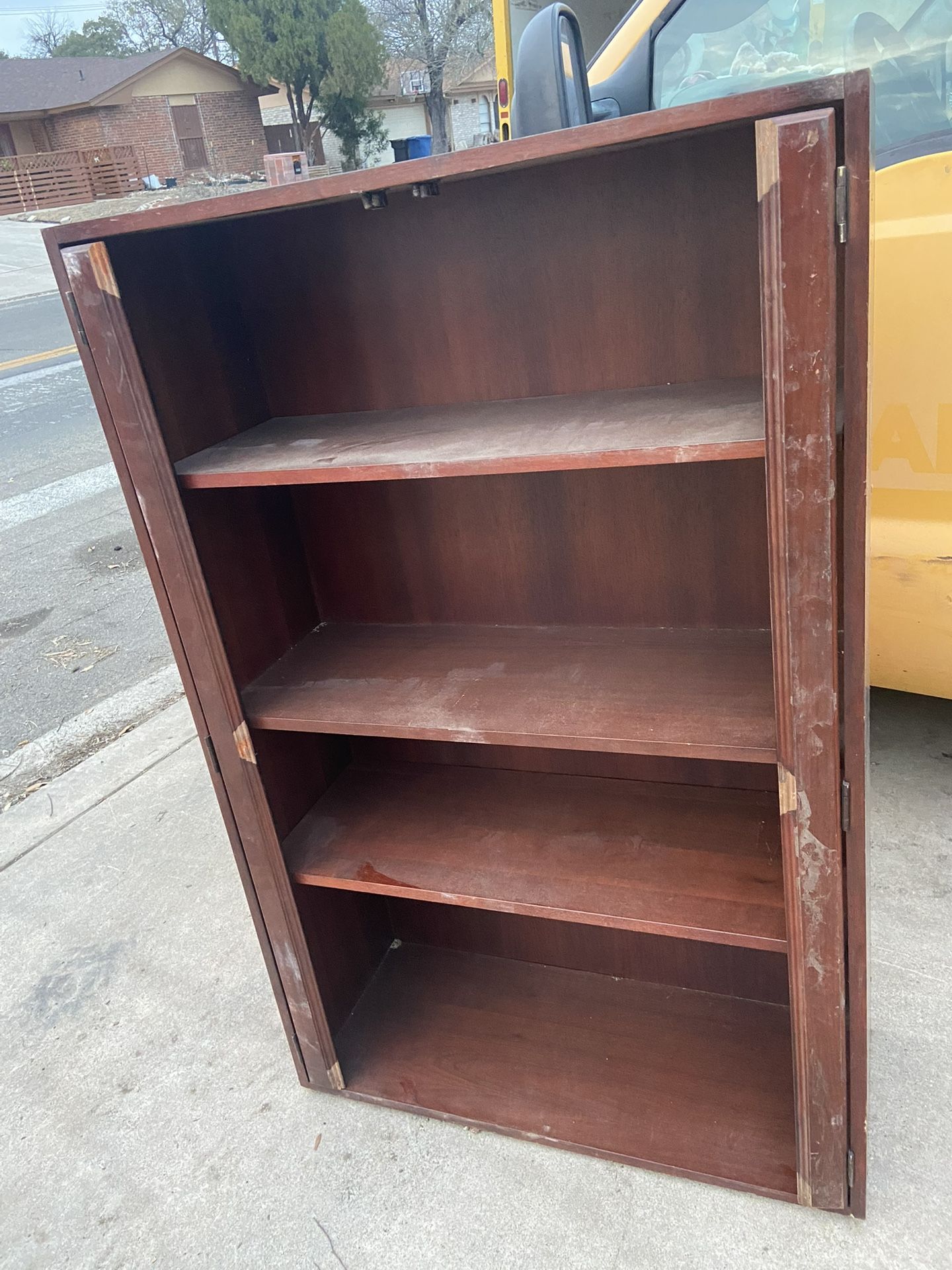 Sturdy bookshelf with multiple shelves. Great accent to any home or apartment. Solid in current condition or awesome project piece. Please be warned item had cabinet doors at one time cabinet doors are not included, but the border of the cabinet doors are still on the shelf. Length 33 inches Width 13 inches Height 52 inches