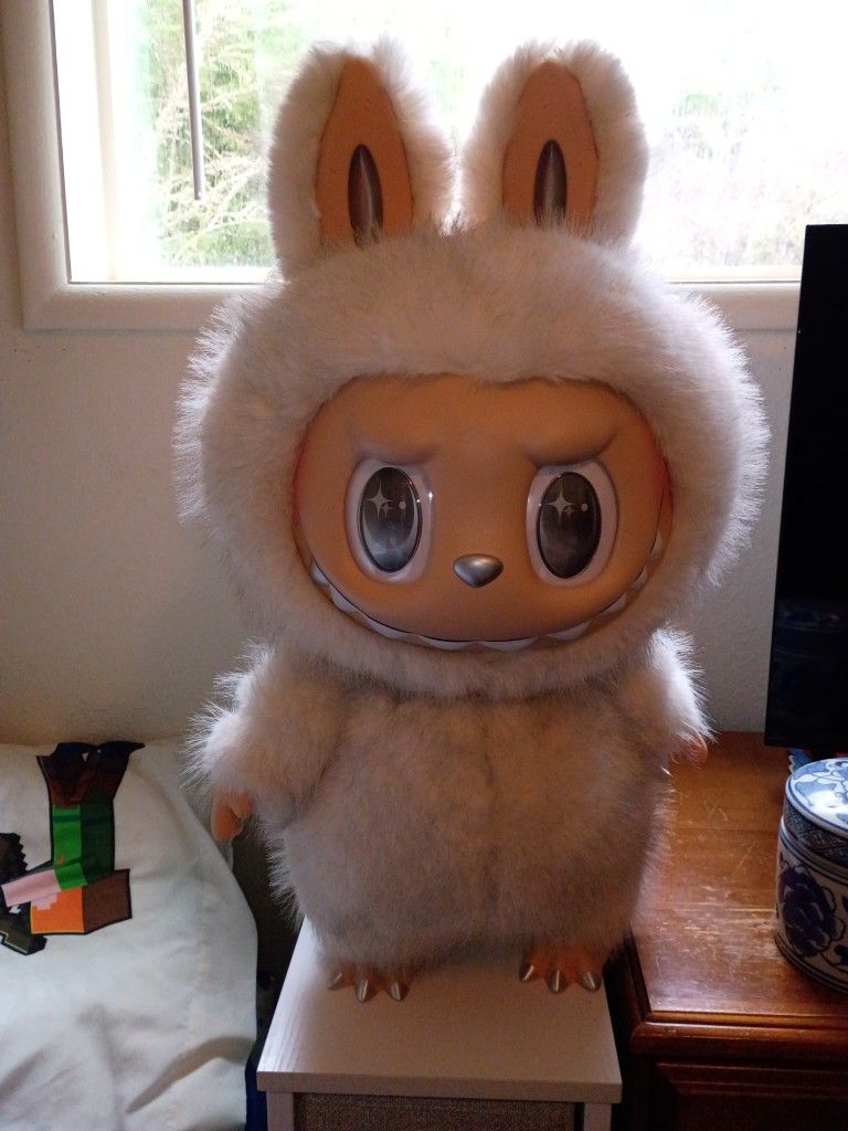 Monster/labubu ' Angel in clouds ' Bottom corner of box got slightly damaged, comes with tote bag. Has been removed from box but is kept in box.