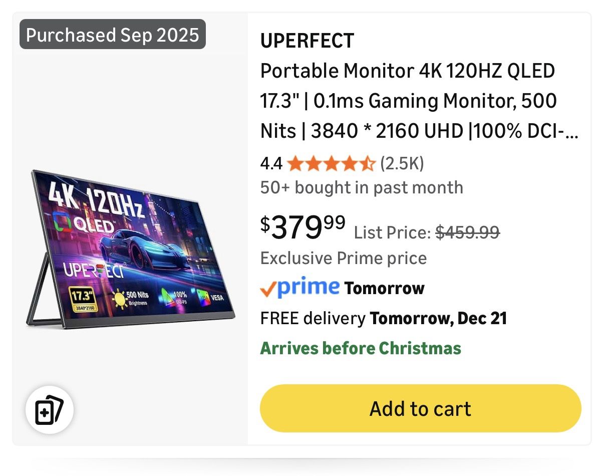 UPERFECT 17.3” portable monitor (4K UHD, 120Hz, QLED). Purchased in September, used only 1–2 times, in excellent like-new condition. Comes with original box and all cables, and I will also include the dedicated carrying case, which is almost new as well. Great for gaming, work, or travel. No issues at all.
