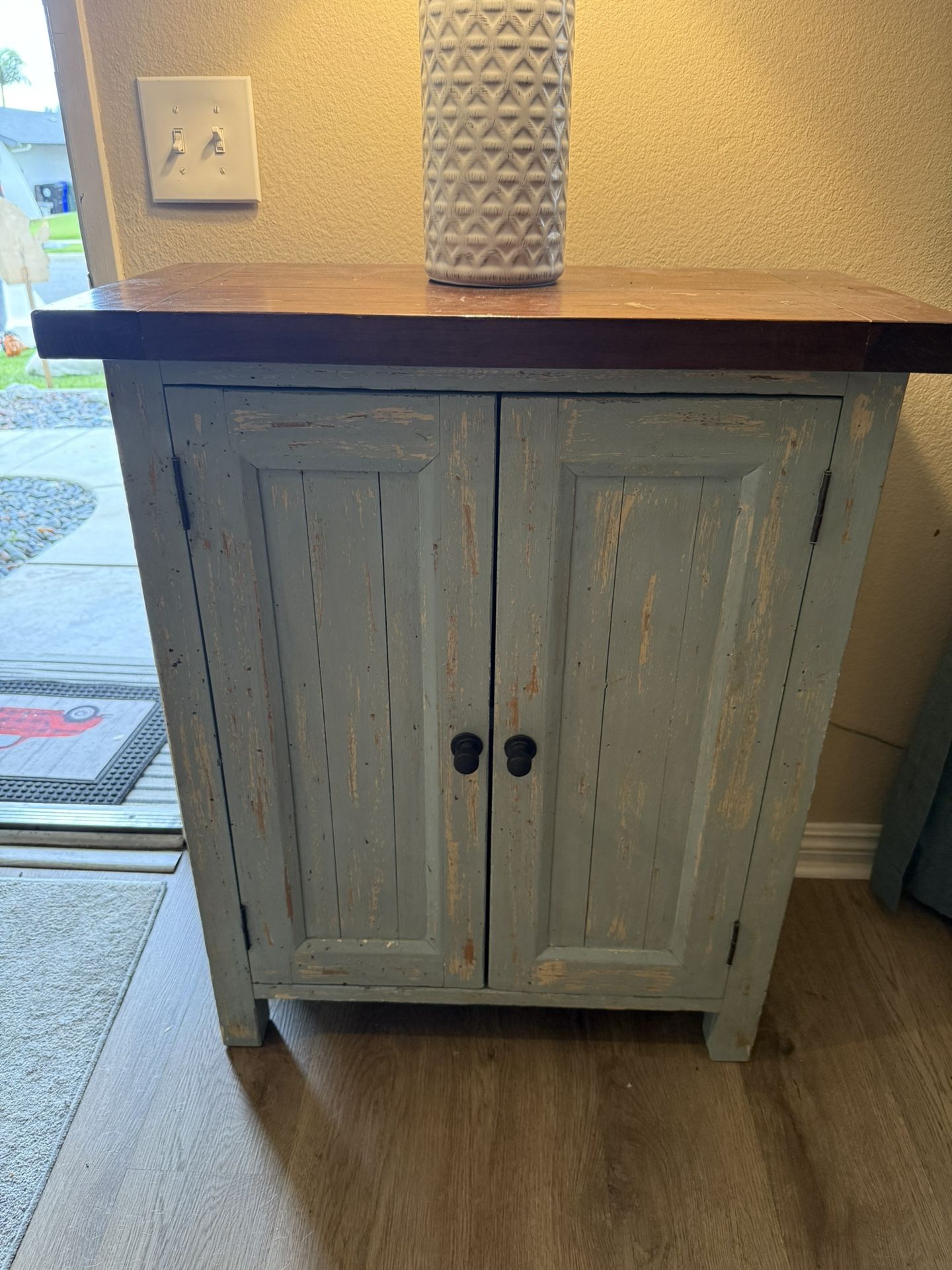 Wood cabinet. Brown wood on top teal wood on the bottom.