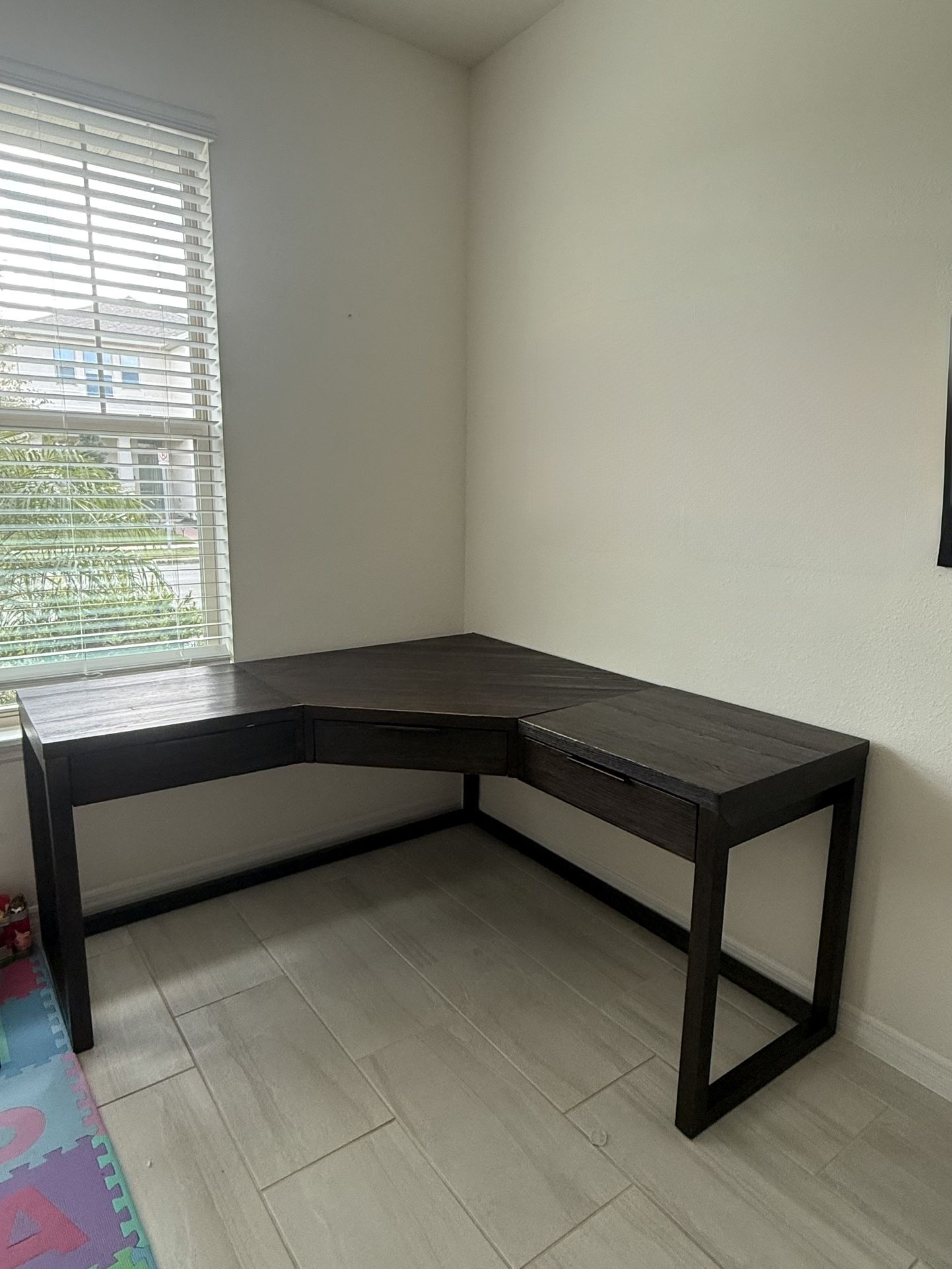 Beautiful wooden L spaced dark espresso desk. Still selling on Living Spaces website for $795.