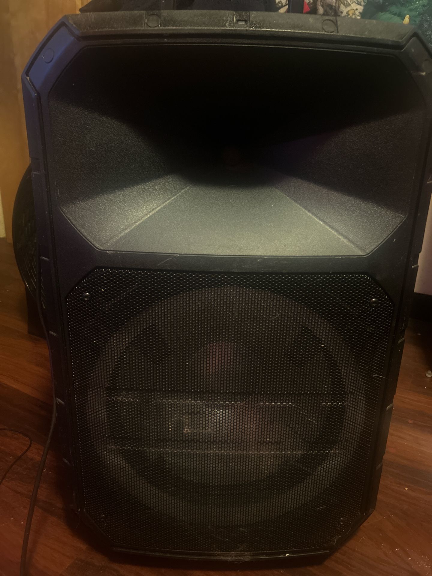 This item is Bluetooth powered and the name it total pa ultra before connecting make sure to push the power button on the back of the speaker at the bottom this item does have to be plugged into a outlet