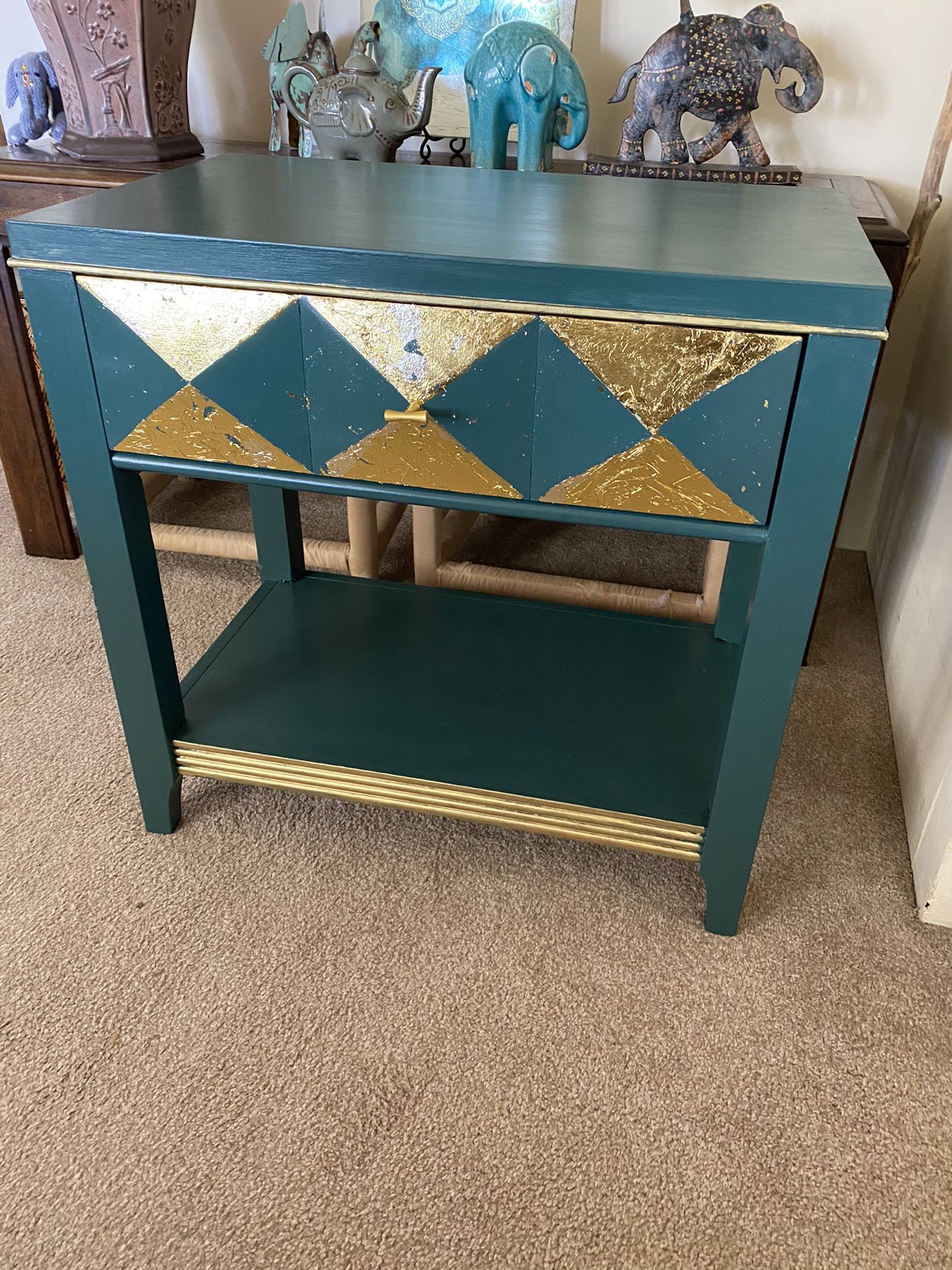 Newly refinished in deep green with confetti gold foil detailing. Could be used as nightstand, end table, in your entryway, most anywhere! Solid wood construction. 28” high, 17” deep, and 28”long.