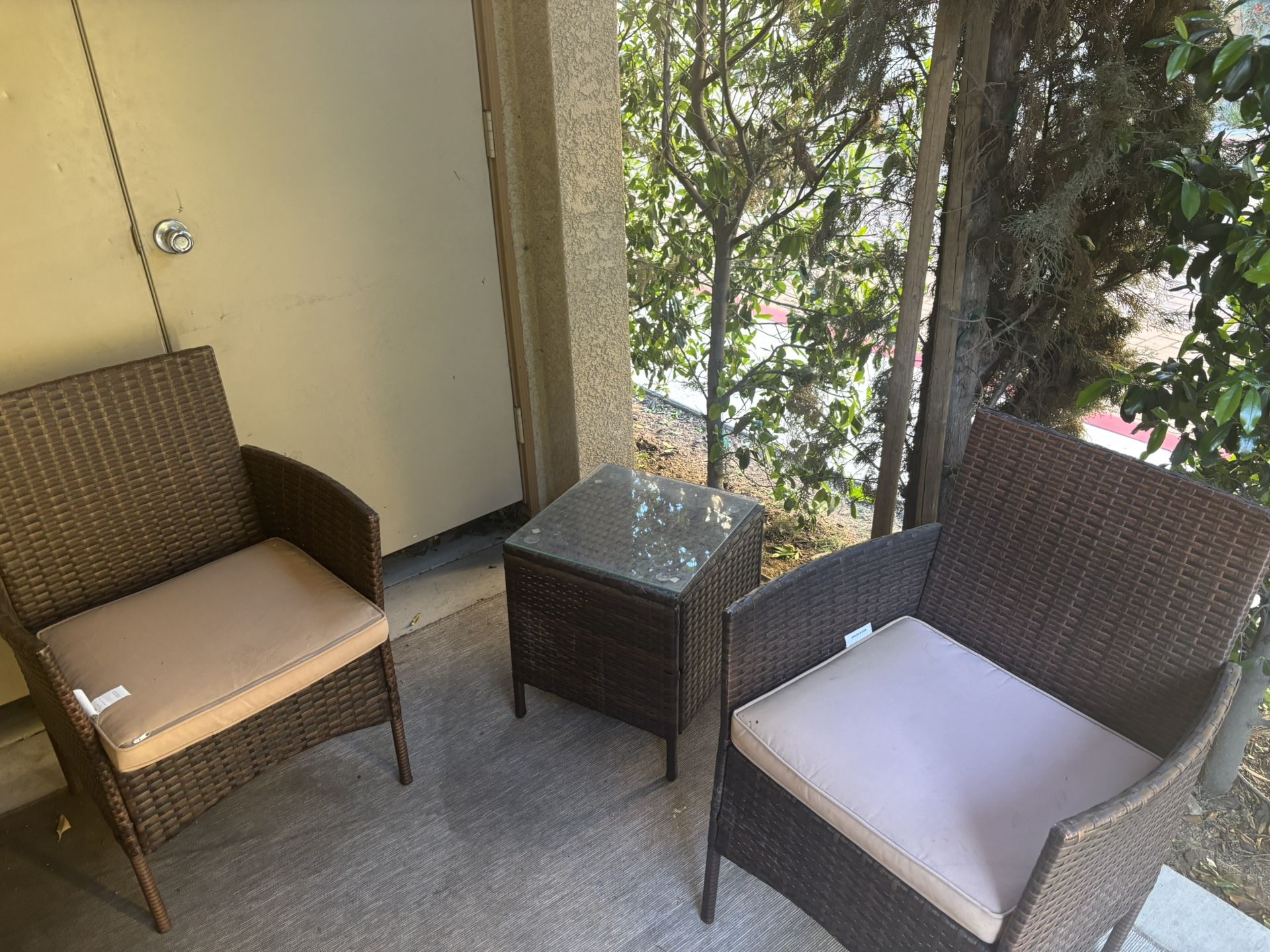 Wicker yard furniture, brown, two chairs, one table glass top
