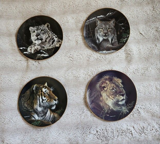 This is the Nature's Majestic Cats plate collection from The Hamilton Collection. Pictured here are four of eight plates by the artist Martiena Richter. Each bears the artist's signature. Each plate measures 8 inches in diameter. They are rimmed in 24 karat gold and are numbered. The pictured plates' issue dates are 1993 and 1994. The original issue price was $30 per plate. The set consists of the following plates: Himalayan Snow Leopard 1993 #1698C Canadian Lynx 1994 #4713A African Lion 1993 #4438B Siberian Tiger 1993 #3099N