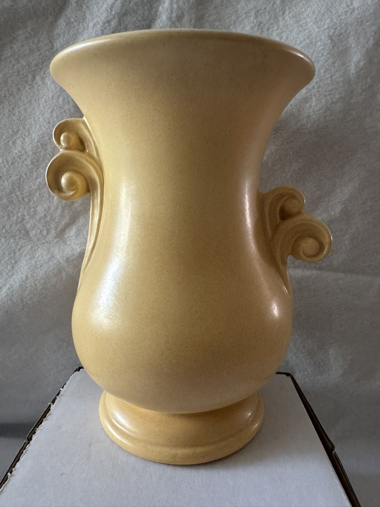 Rum Rill - 1930’s Art Deco Pottery Vase # 634 Scroll Handles Matte Yellow and Teal 7 1/2 inches tall by 6 1/2 inches wide Cash only please