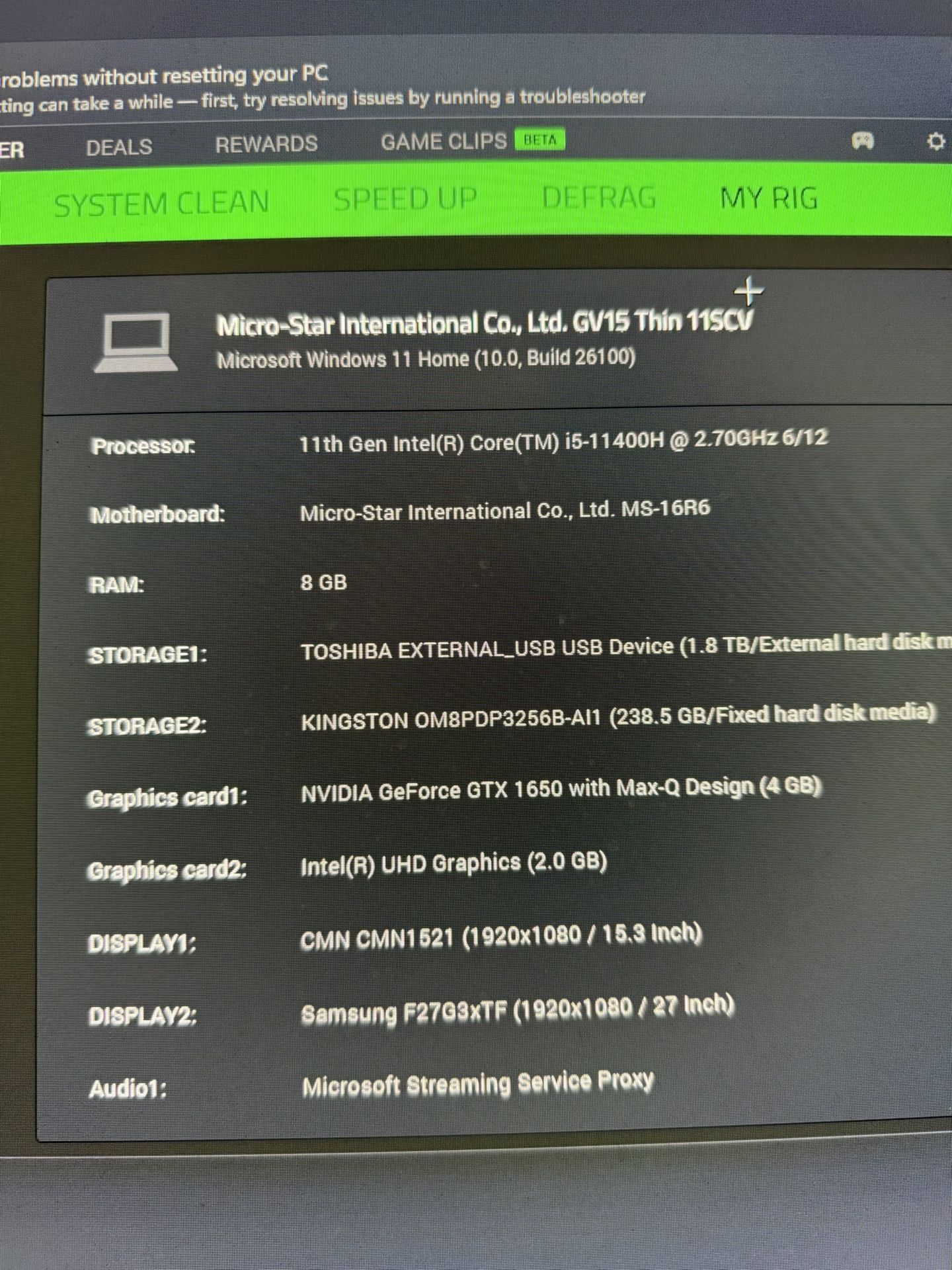 Selling my MSI GV15 Thin gaming laptop in good working condition. Runs smooth and is great for gaming, school, and everyday use. Specs: • CPU: Intel Core i5-11400H (11th Gen, 6 cores / 12 threads) • GPU: NVIDIA GeForce GTX 1650 Max-Q (4GB VRAM) • RAM: 8GB • Display: 15.6” Full HD (1920x1080) • OS: Windows 11 Home Performance: • Runs Fortnite, Minecraft, Roblox, Valorant well • Good for streaming, homework, and multitasking • Fast boot and load times thanks to SSD Notes: • Laptop only (no external hard drive included) • Normal cosmetic wear, nothing affecting performance • Charger included Perfect entry-level gaming laptop or solid daily driver. Message me if interested. Open to reasonable offers.