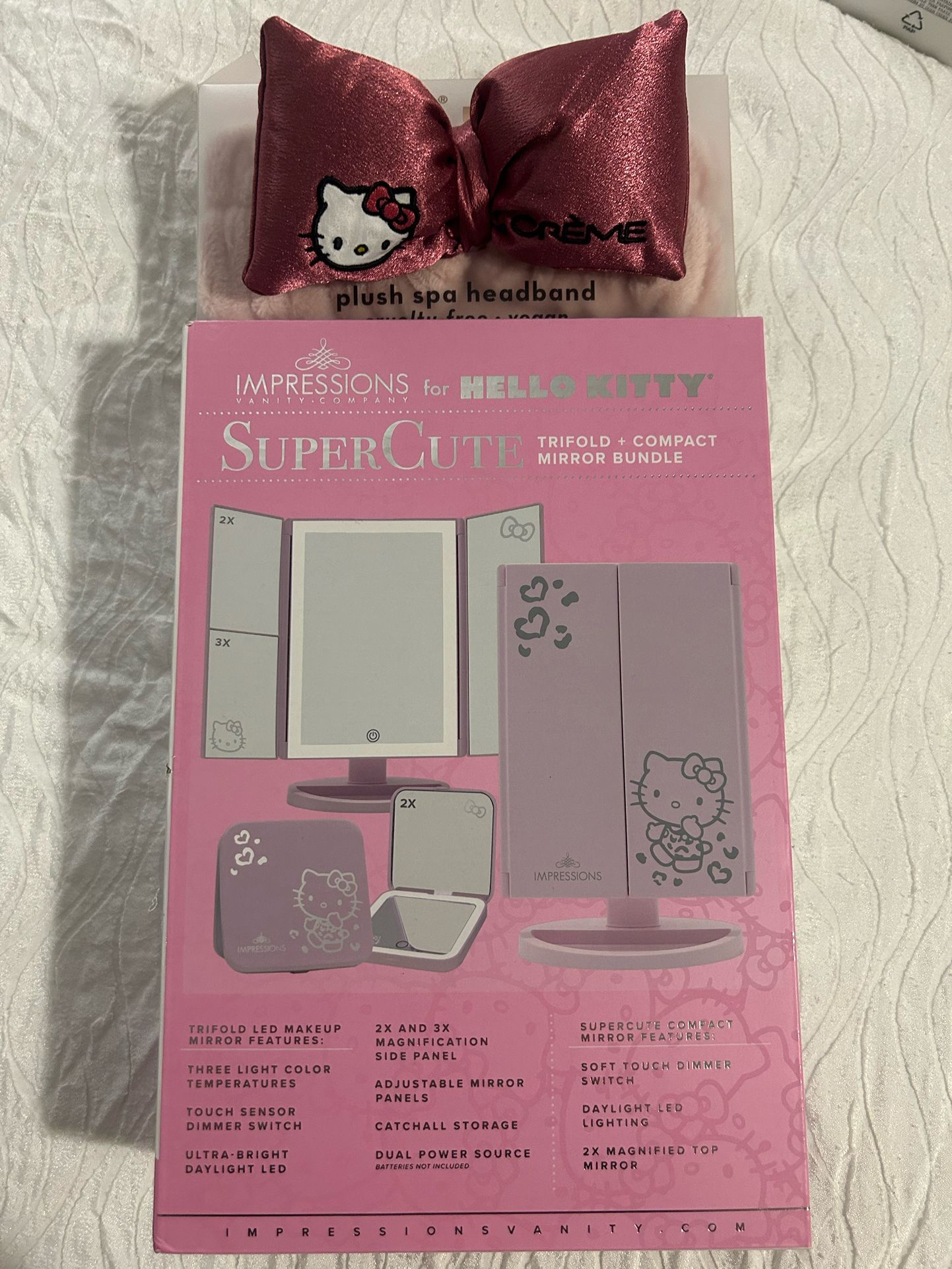 Brand new in box. Never taken out of the box. Retail: $72 + taxes Completely sold out! Comes with the trifold mirror with vanity lights and a compact mirror with lights and 2x mirror. Kk Super cute hello kitty mirror from impressions