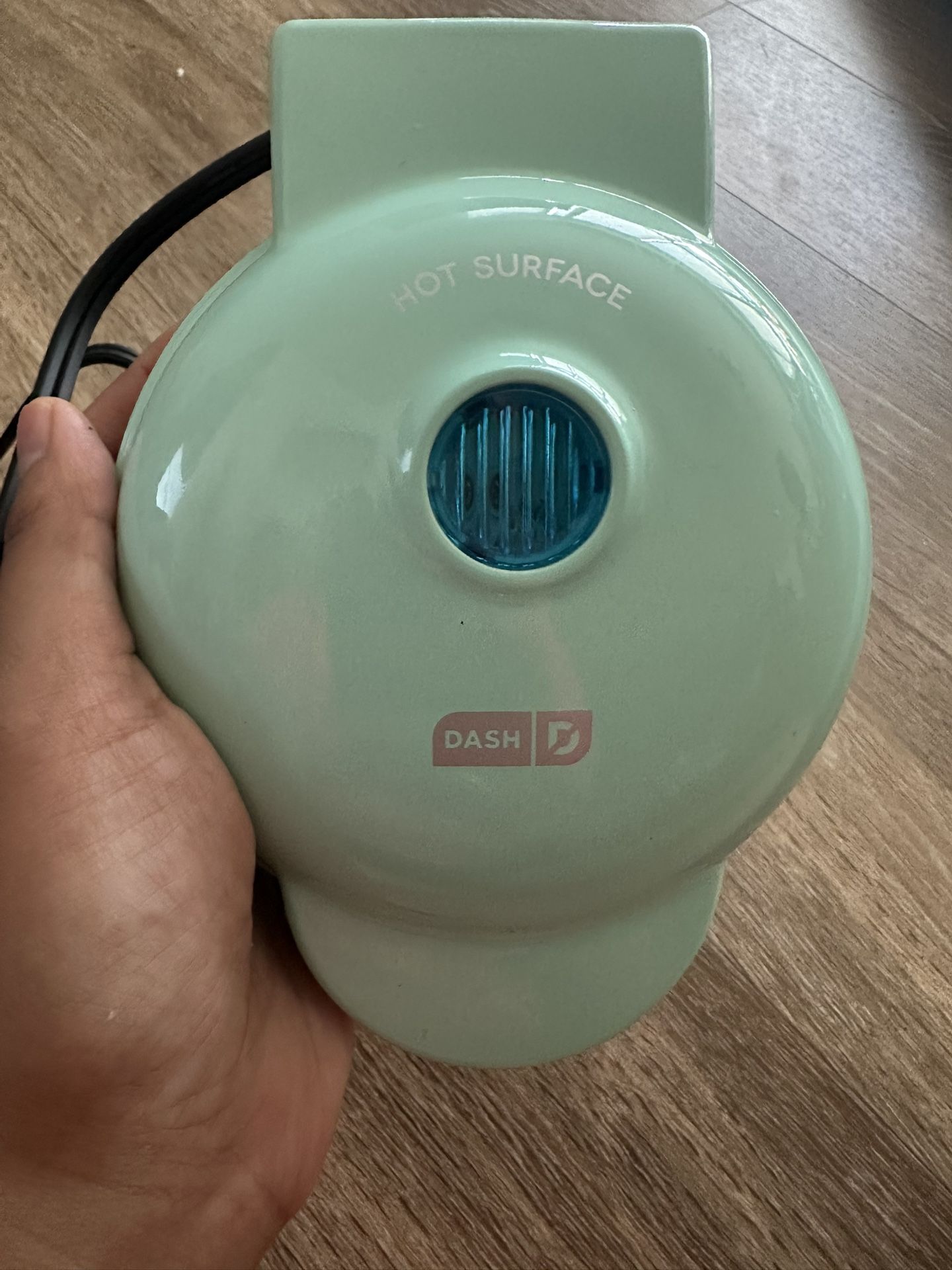 Compact Dash mini waffle maker in aqua color. Perfect for quick, single-serve waffles, hash browns, or other breakfast treats. Heats up quickly and has a non-stick surface for easy cleanup. Lightweight and space-saving design, great for small kitchens, dorms, or as a fun gift. Works perfectly and in good condition.