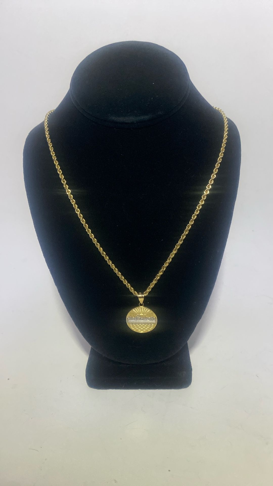 9.4g 14k gold chain and last supper pendant. This chain is beautiful. It is a 22 inch. So hangs nice around your chest and the beauty of the pendant brings the pair to life. $ 850 firm, let me know if your interested. I buy gold.