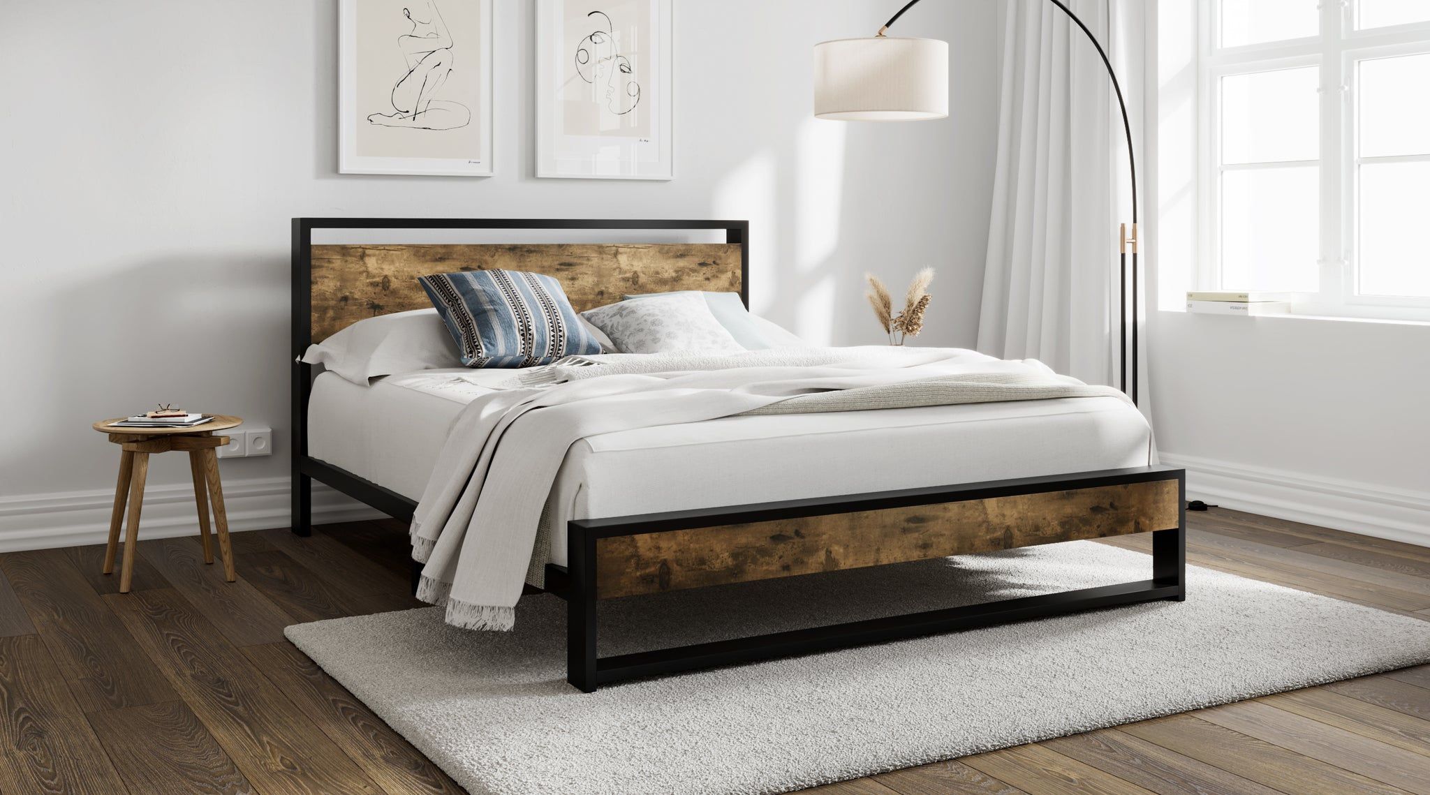 Queen Platform Bed Frame with Wooden Headboard and Strong Steel Slats Support, Dark Brown
