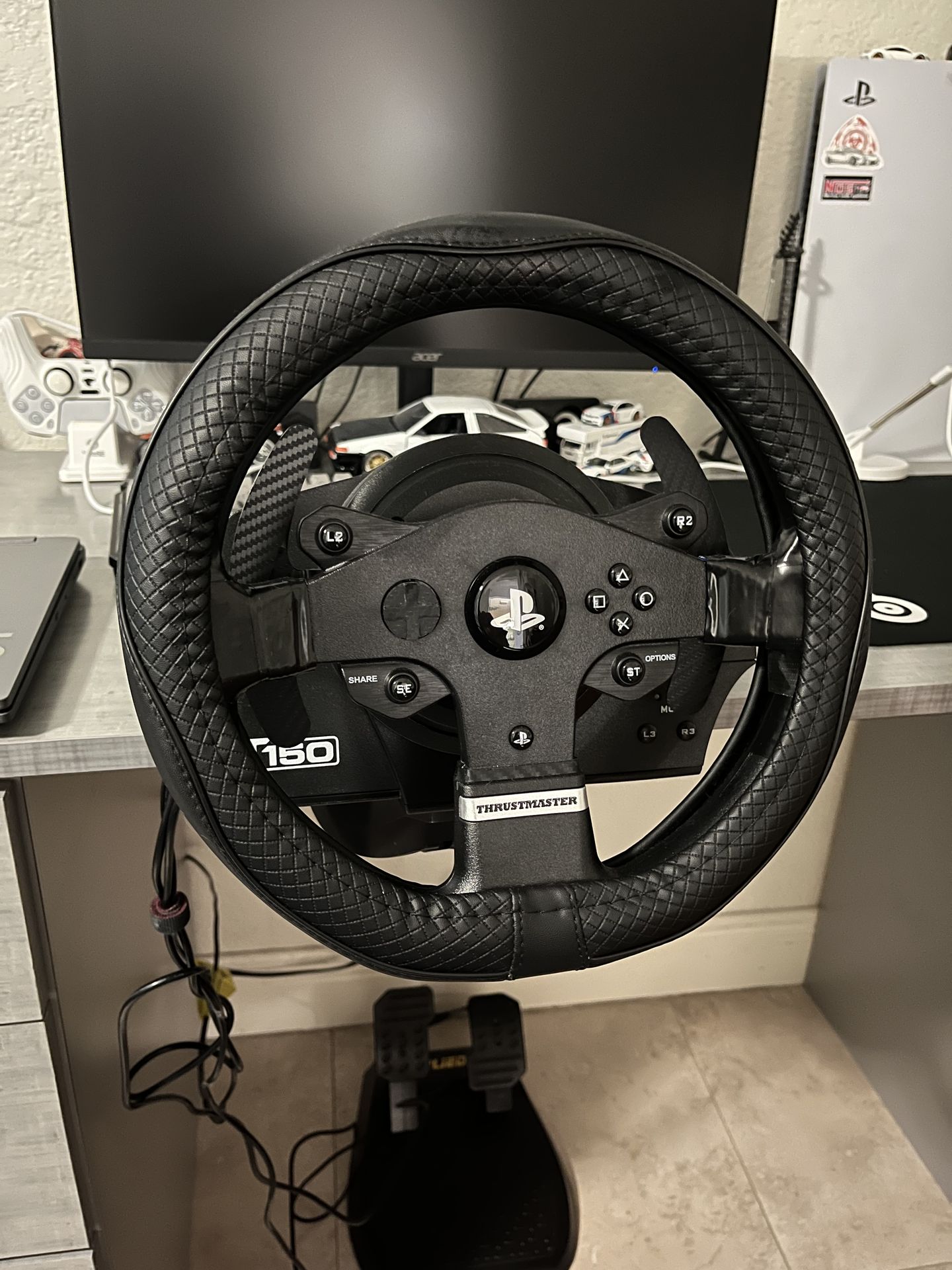 Sim racing wheel. Wheels and pedals included in the price. Perfect condition, nothing wrong with it and it was modified with a leather sleeve.
