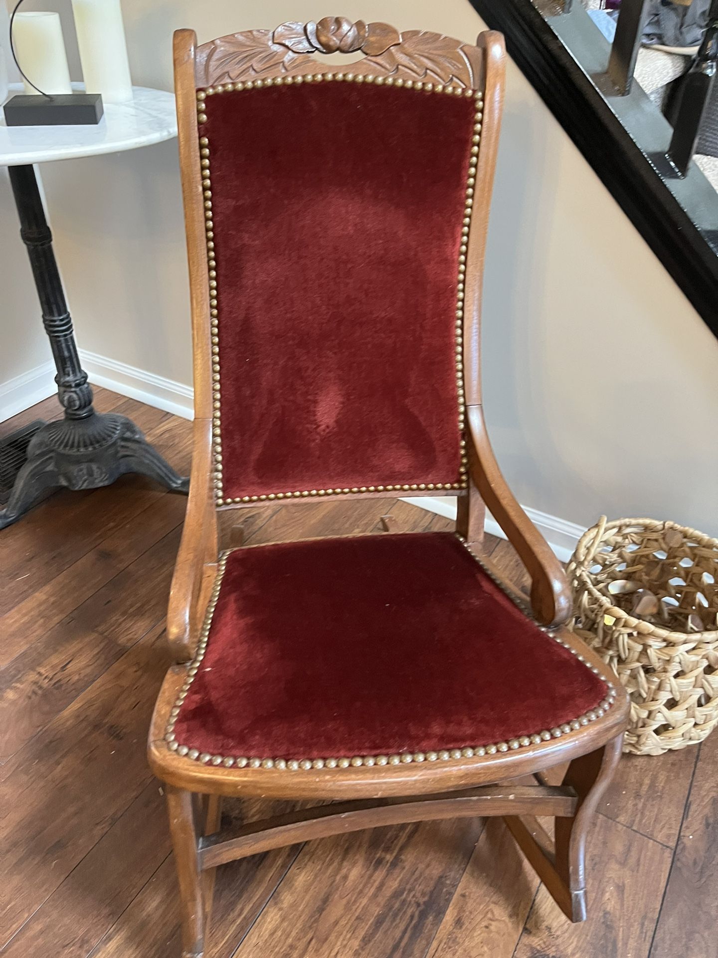 Vintage children’s rocking chair in good condition. Dark red/burgundy velvet fabric with brass nailhead trim. Comfortable. Just grown out of it. Slight creaking if rocking without rug under it.