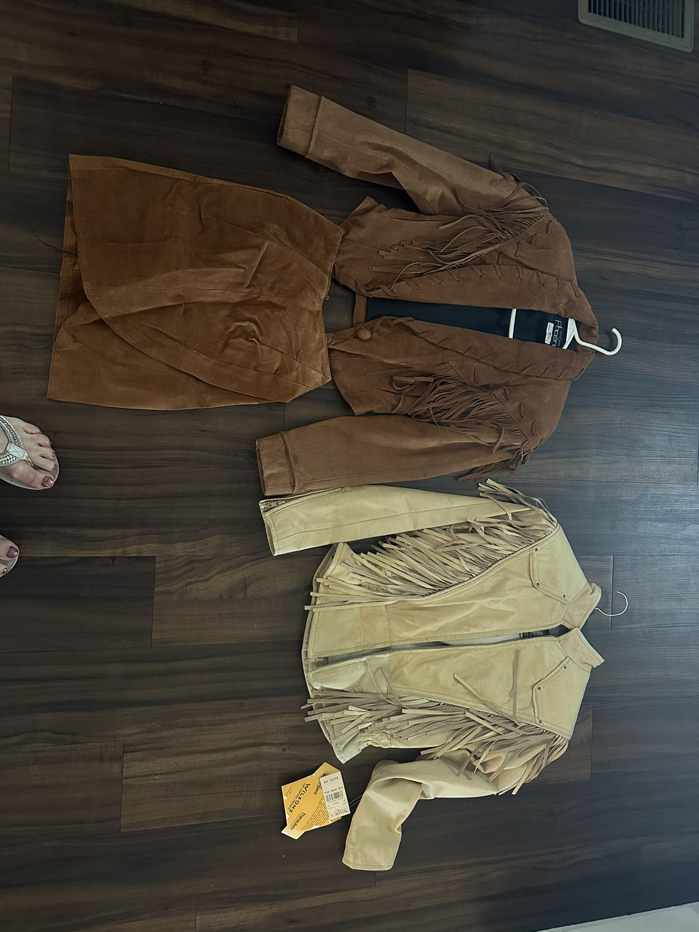 Brand new $225 tags still on light genuine leather fringe jacket brand new. Rust genuine suede jacket and skirt great condition, so cute. Both smalls but fit like mediums! $90 for both