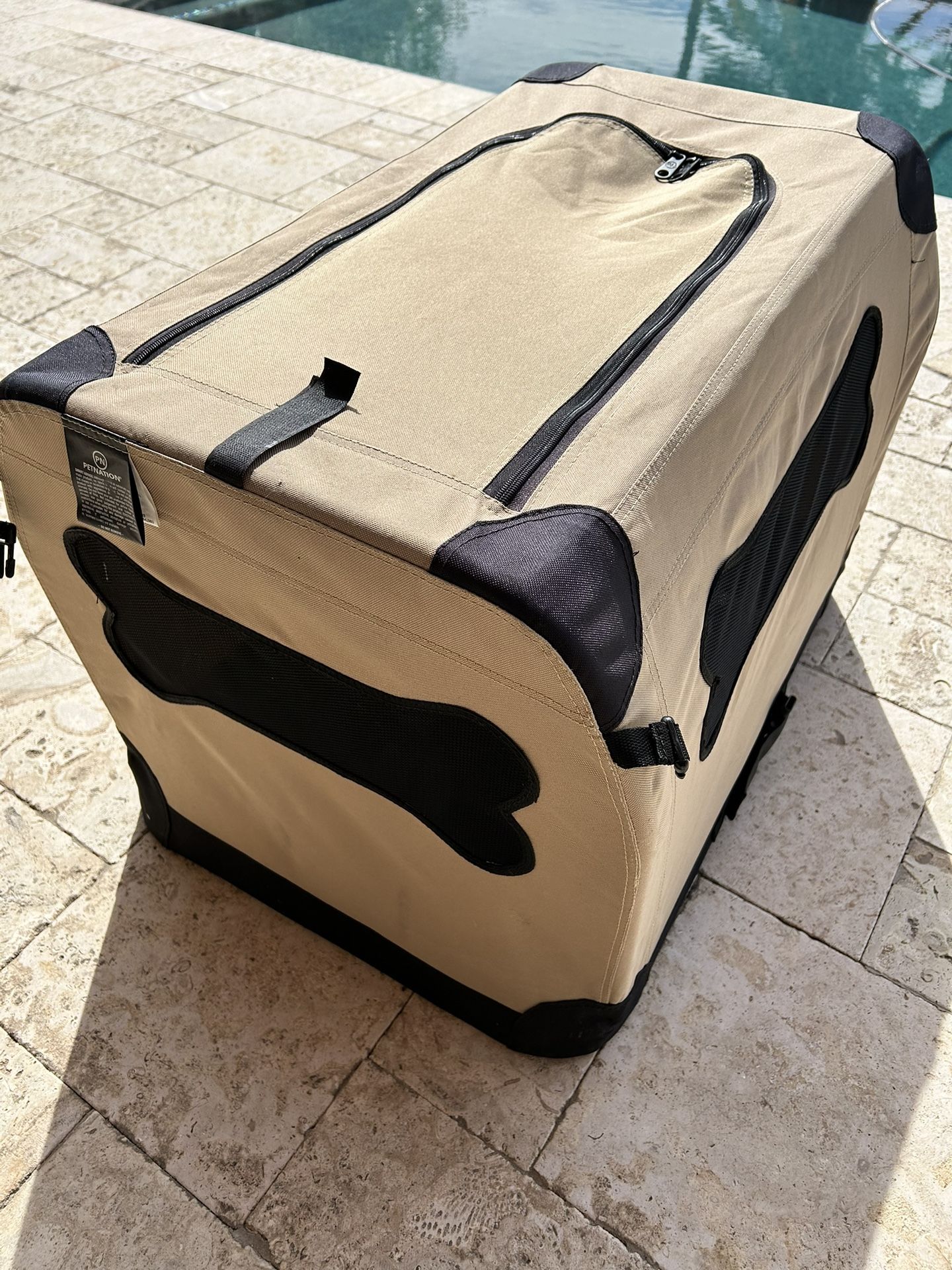 Portable dog kennel. Size is 20 x 28. 20 inches tall. Has zipper on top and front.
