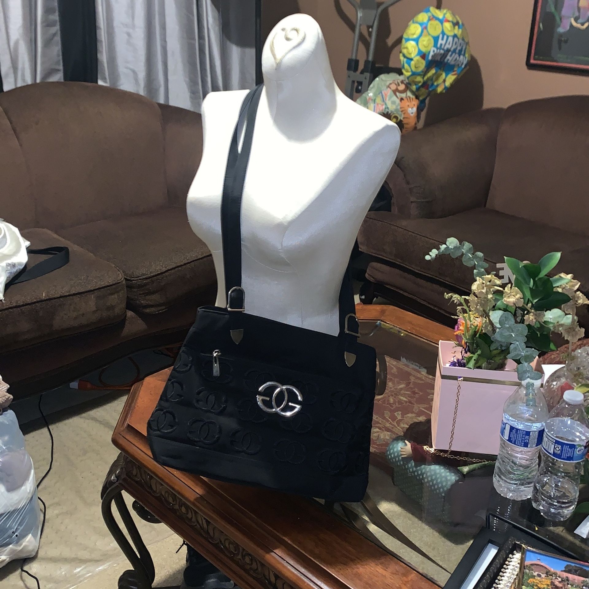 Black , Guess embroidery , long straps three compartments inside and extra compartment out side on back