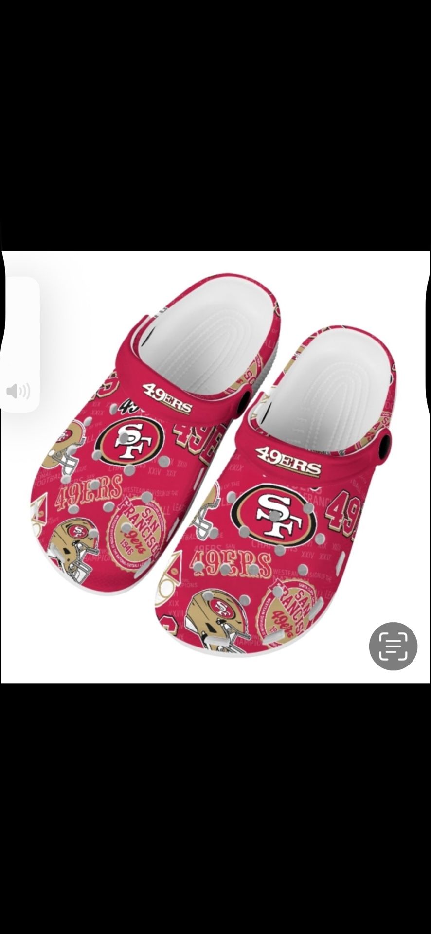 White or red 49er croc like crocs. Not namebrand crocs but just like crocs they are amazing! $30 unless you mention Anne that gives you five dollars off so each pair is $25 size 42 and 43 that's a size 9 and 10 there are many
