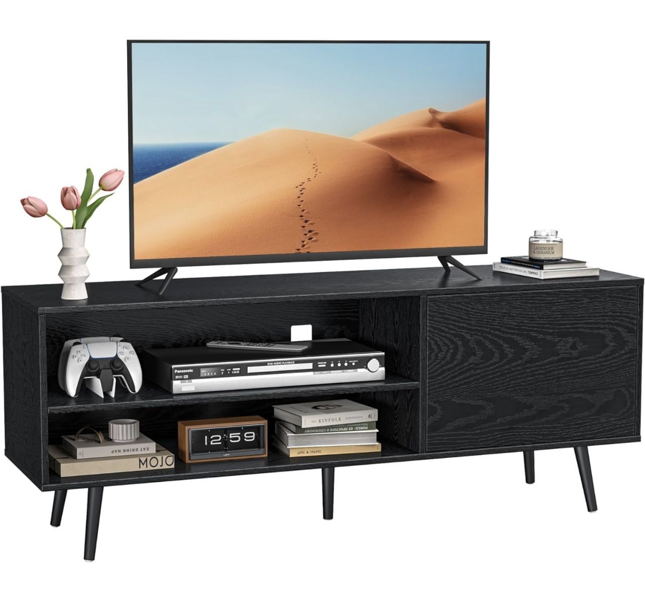 MEDIA STORAGE SOLUTION: Display your pictures, decorations, books, and plants in the open shelving area or on the tabletop surface. A cabinet with a push-to-open door provides storage for remote controls, DVDs, and other media. Our TV console cabinet can help any home feel neater and more organized. CABLE MANAGEMENT: For easy access to the cut-out hole in the back of the wooden TV stand, suitable for Xbox, PS4 Pro and other AV components in the open shelving side, allowing you to pass through cables and organize wires for your devices. ADJUSTABLE SHELF: With a distinguished design and a touch of modern appeal, this TV console with storage is an excellent choice for your entertainment room. Featuring a height adjustable open shelf, you can adjust the shelf height according to your needs. BLACK TV STAND: Black wood grain of the tabletop adds character to any contemporary household. The inspired design fits in with many styles, including mid-century modern, rustic, and traditional. Complement your living space with a balance of fashion and function. EASY TO ASSEMBLE: Our TV stand can accommodate most flat screen and curved TVs up to 70 inches and can hold up to 110 lbs