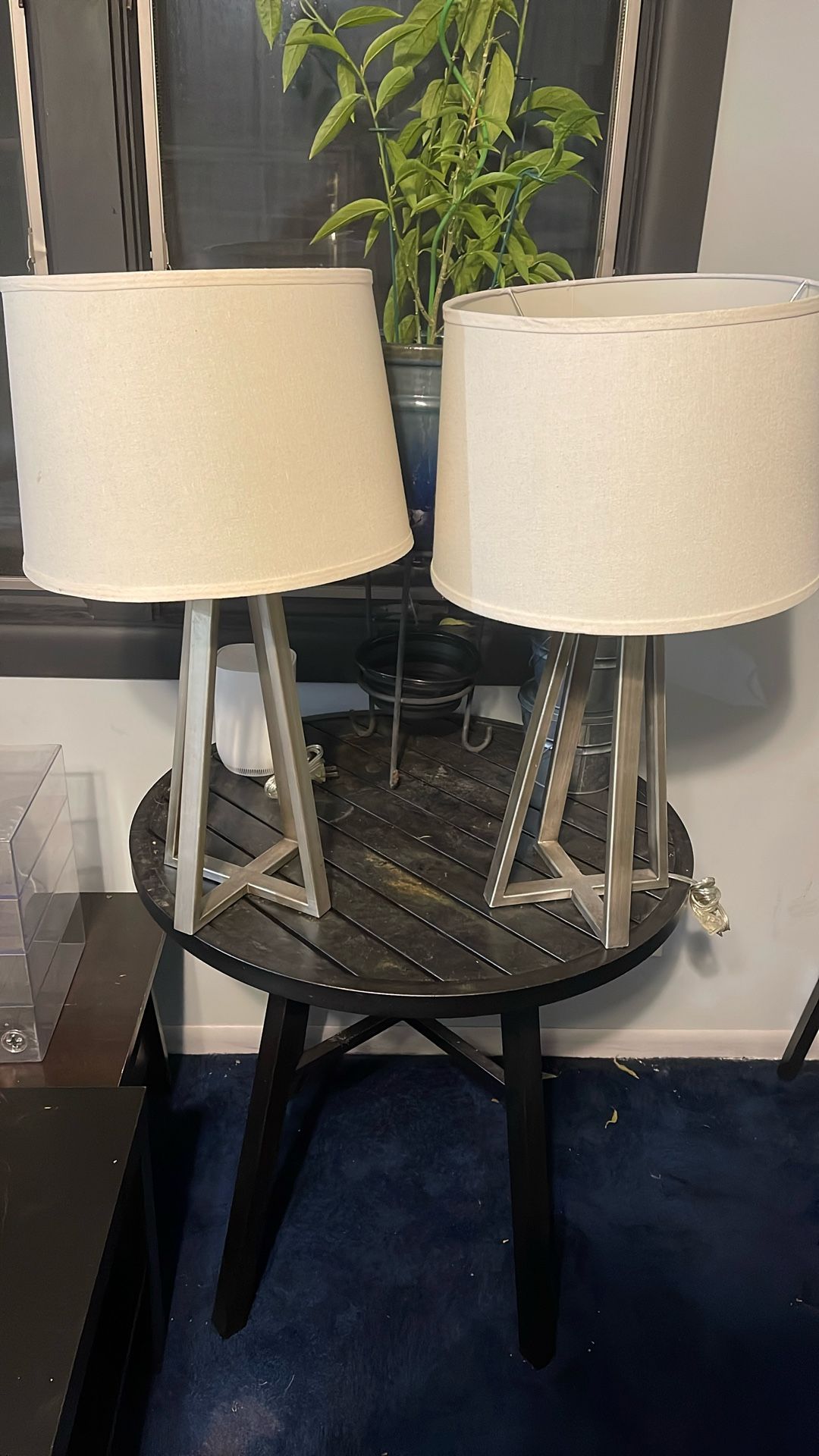 2 beautiful modern lamps made out of aluminum frame, no physical damage, works good, it looks nice on rooms and living rooms both for $30