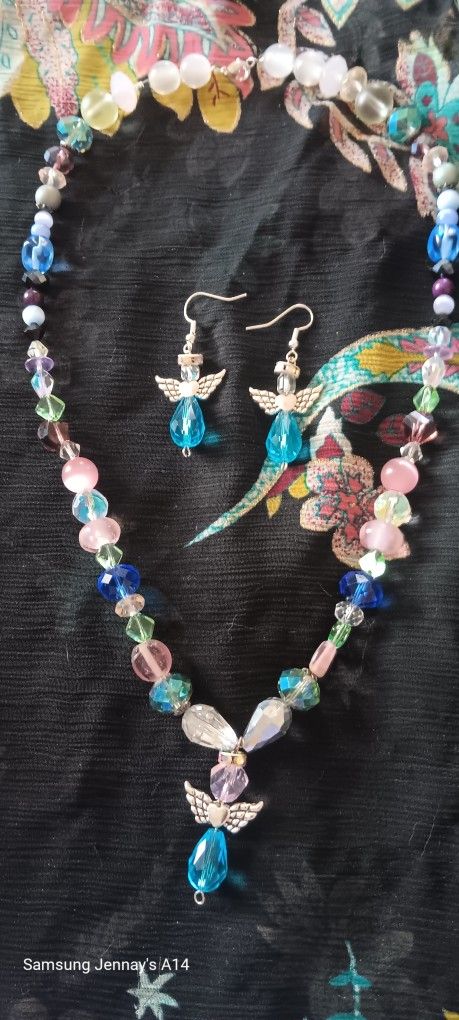 Glass Bead Necklace With Angel Necklace And Earrings.