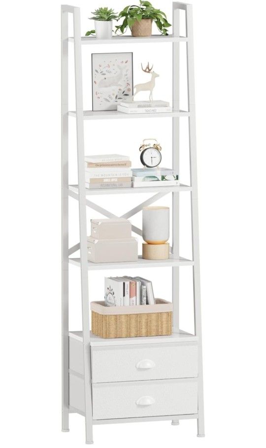Furologee 5-Tier Ladder Shelf with 2 Drawers,Narrow Bookshelf Storage Shelves,Industrial Bookcase Freestanding Rack Units for Bedroom,Living Room,Bathroom,Home Office,Balcony,Wood Metal, White