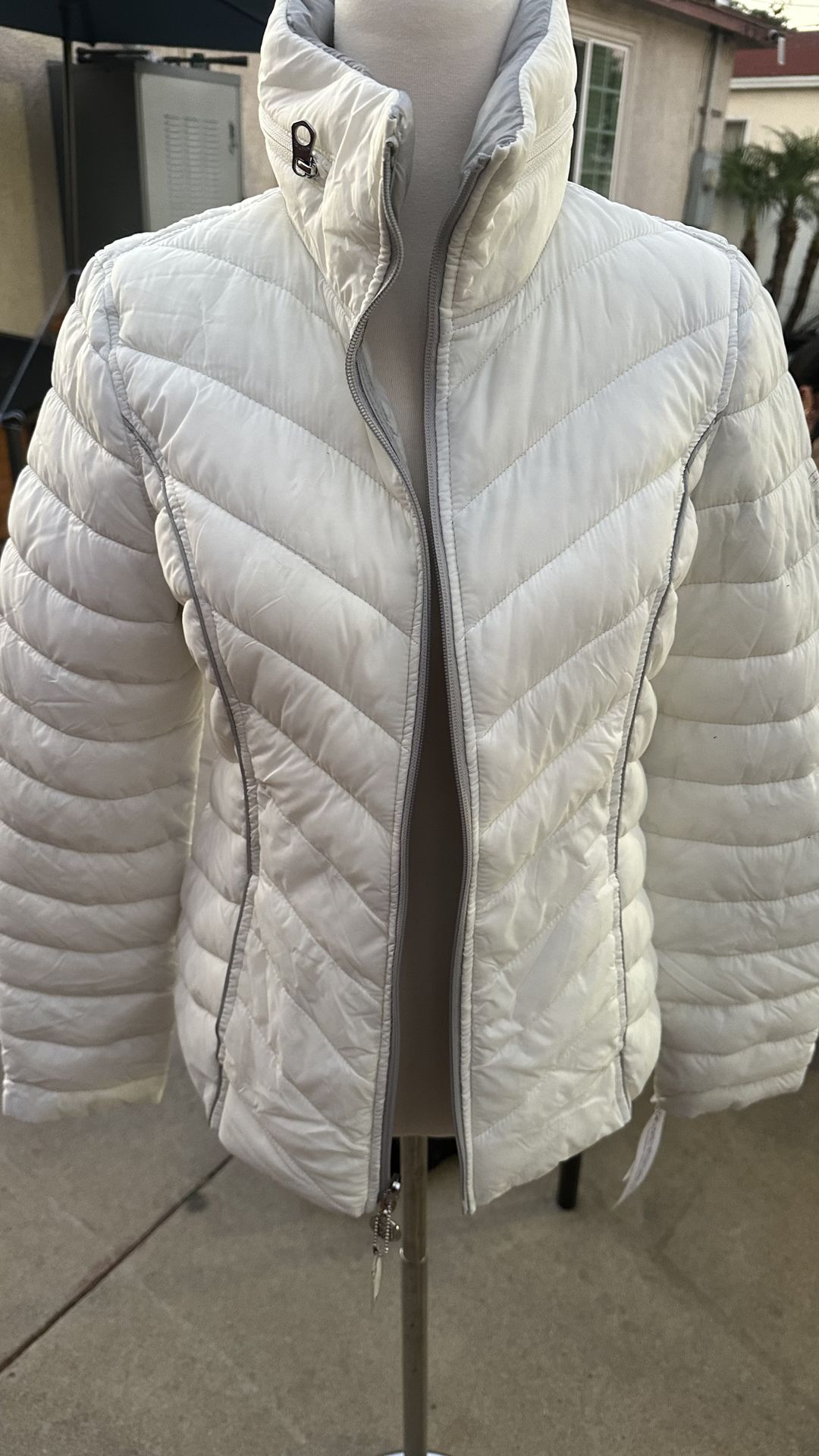 Brand new Nautica reversible jacket. There is a very visible stain on the sleeve on the white side but non on gray side. Selling cheap due to the stain