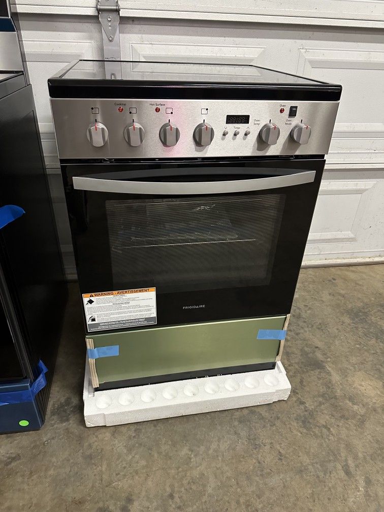 New Frigidaire 24-in glass top 4 burners 1.9-cu ft convection oven slide-In electric range stainless steel comes with manufacture warranty and delivery available.