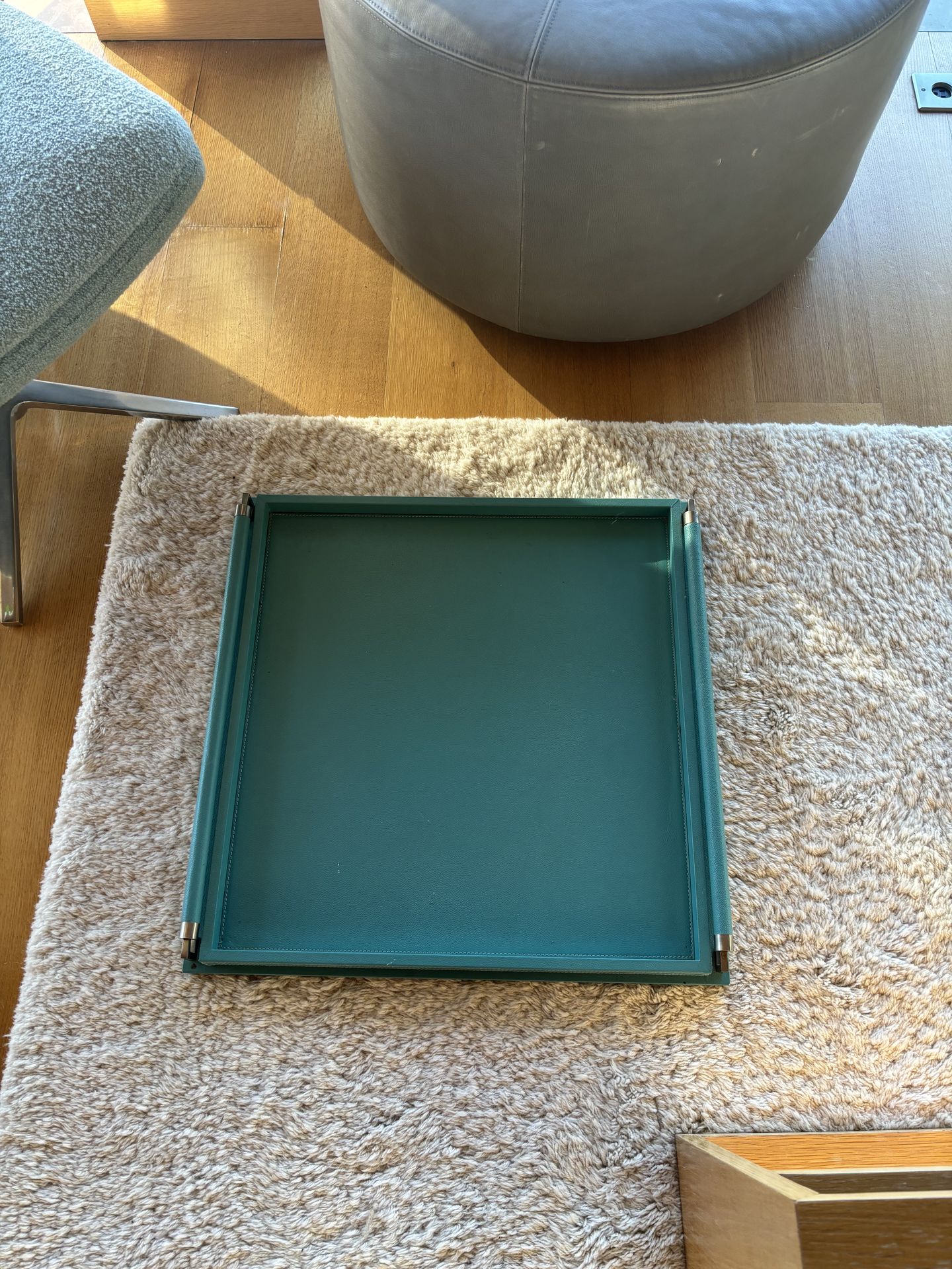 Large square serving tray with metal handles. Great for coffee table, ottoman, or serving drinks. Clean modern design. Dimensions: 24” x 24” x 2” Good condition.