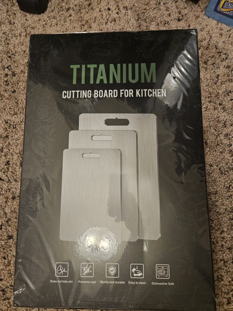 Comes with 3 sizes. Easy to clean durable titanium cutting boards. Brand new never opened. Absolute best for removing lingering bacteria.