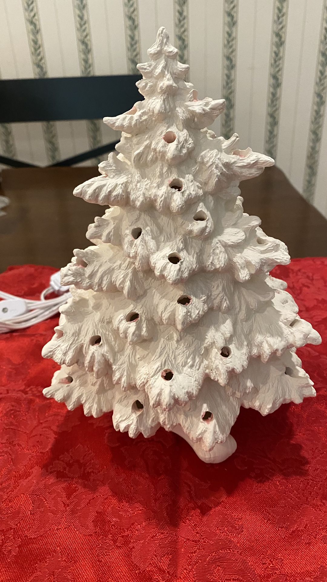 Ready to paint, ceramic bisque Christmas tree stands 10” with base. Comes with light kit, and lights.