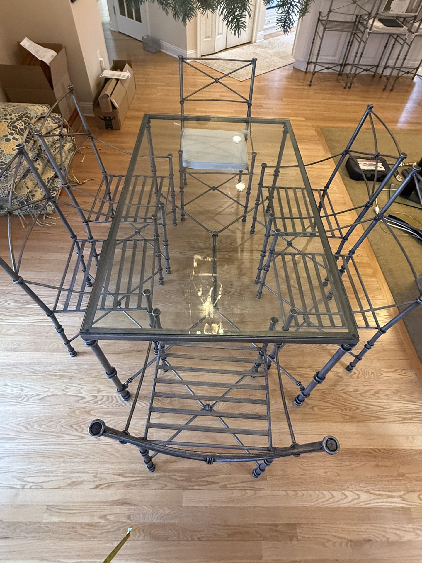 Hello- Selling a beautiful Pier One glass dining room table set with brushed pewter silver metal (no wood), including: Table: 60" long x 38" wide x 29" tall 6 Chairs: 38" tall x 20" wide x 19" deep (cushions are included) +/- for extra $10 (60 total), add on 3 Counter Height Chairs: 40" tall x 20" wide x 19" deep (no cushions included) There are minor light scratches on the glass table from typical wear, otherwise, in good condition. For pick-up in New Hope, PA (18938). $60 for all items (table plus 9 chairs) or $50 for just the table and 6 chairs (if you don't need the counter-height chairs).