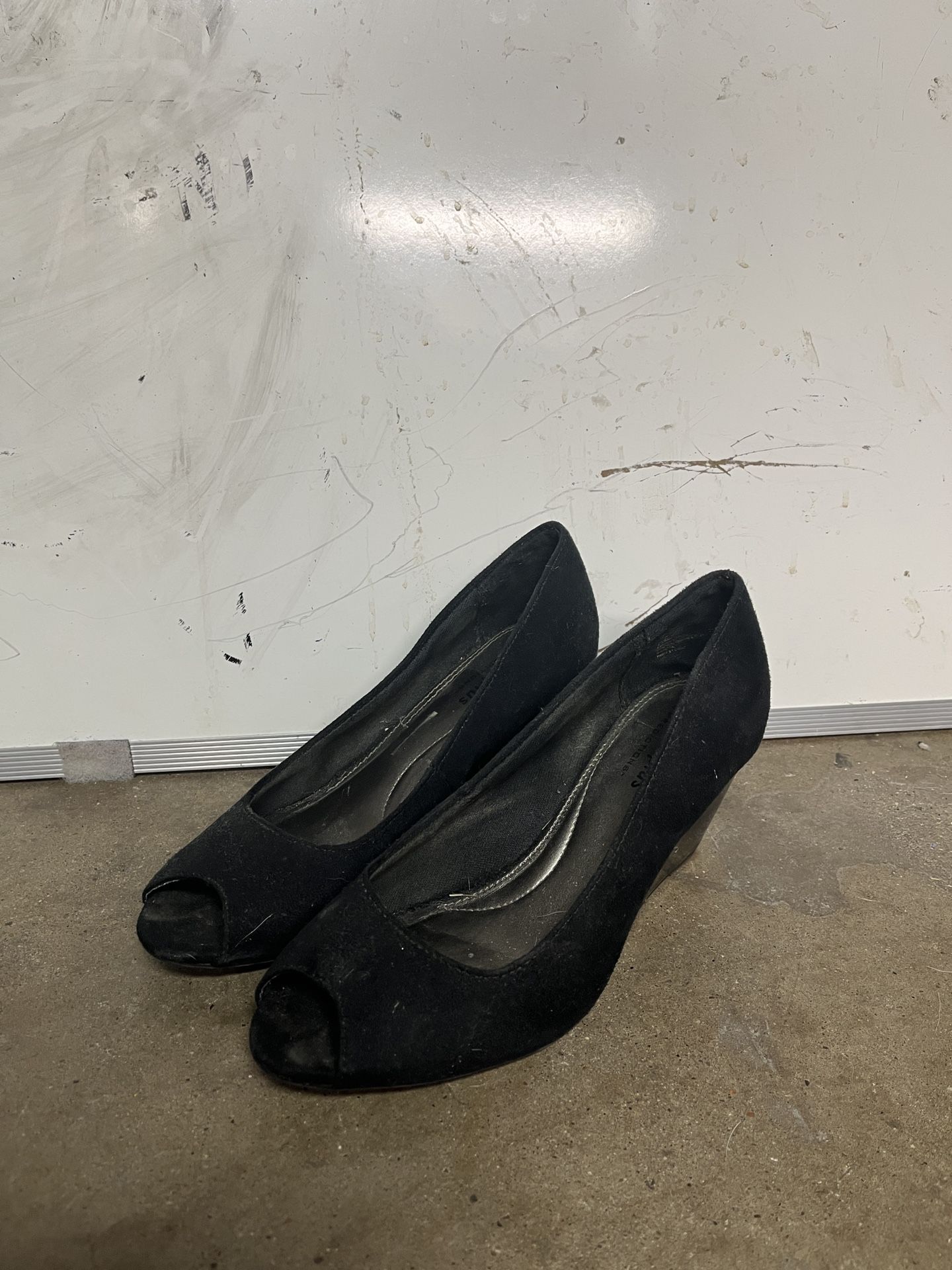 Stylish and comfy black peep-toe wedges – perfect for work, events, or everyday wear. Classic look that matches everything! • Soft black suede-like material • Easy slip-on style • Comfortable wedge heel • Used but in good shape – see pics • Size is not labeled, but fits like a medium/average women’s size 📍 Available for local pickup 💬 Message if interested or want to try on!