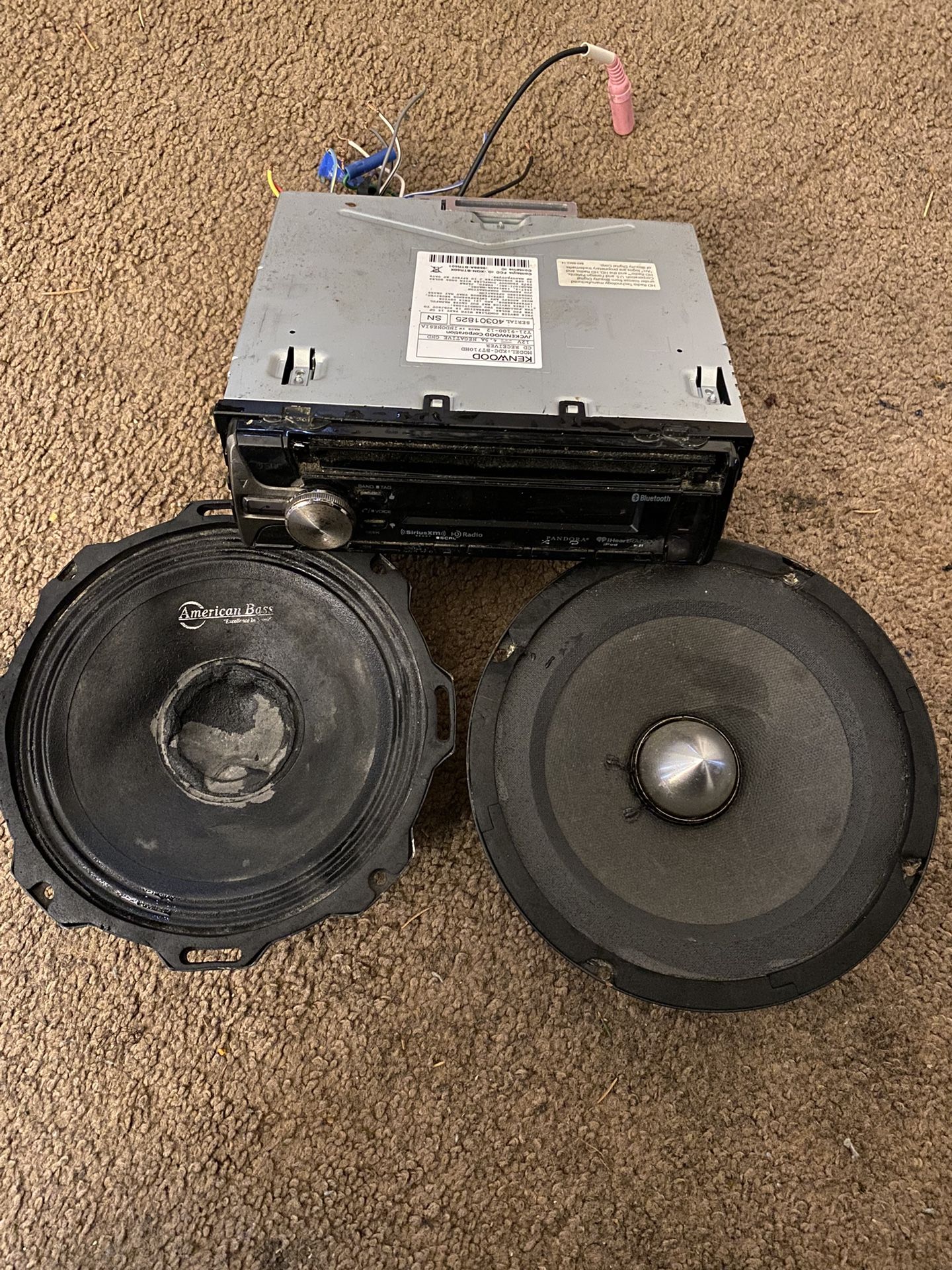 Very Nice Kenwood Radio , 2 American Bass 6.5 everything works as should. Left side speaker a lil wet in the picture tried to clean it off. I will sell separately . 60 for the Radio , 60 for both speakers.