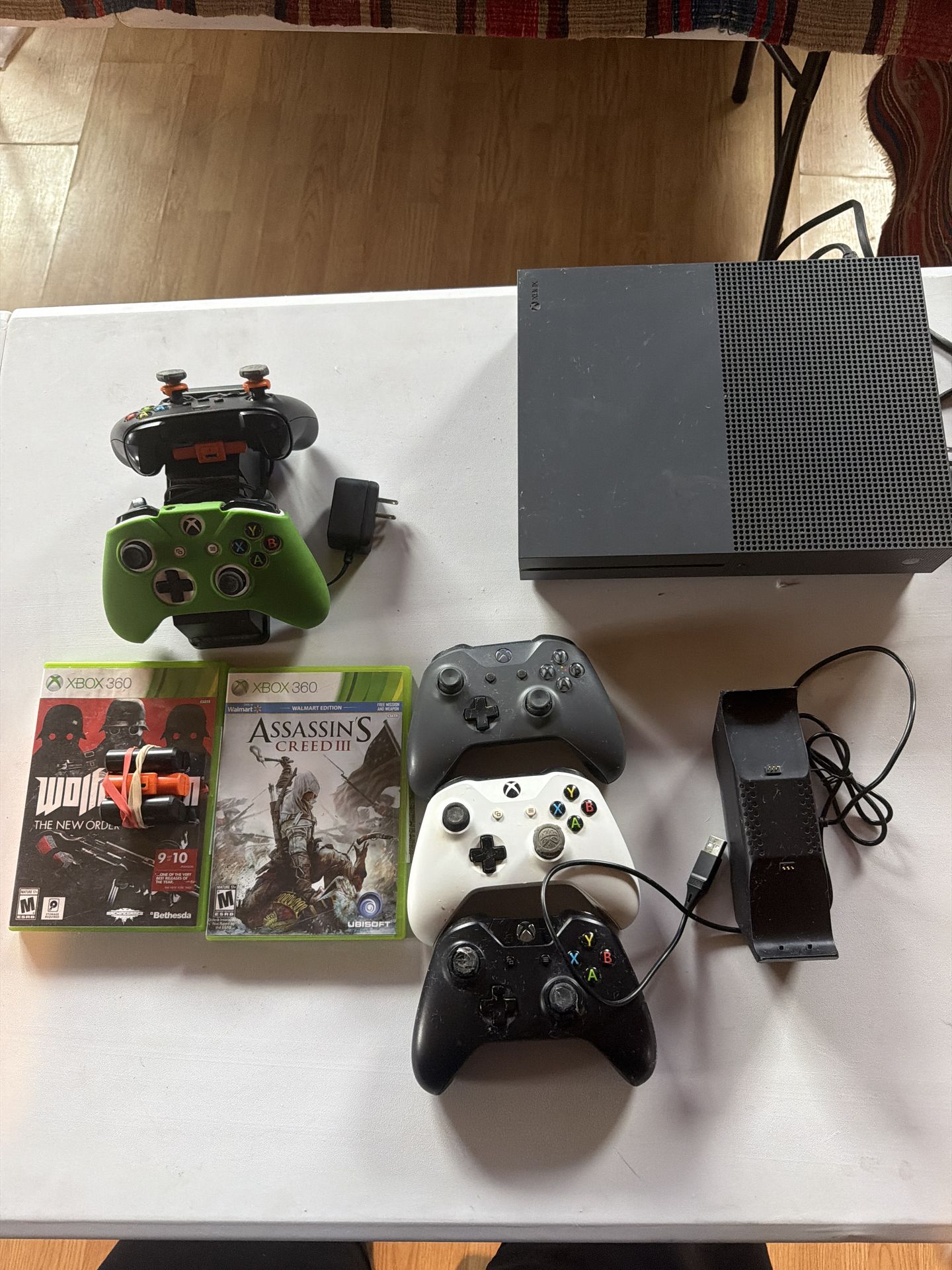 ⸻ Price: $275 OBO ⸻ Description: Xbox One S (Model 1681) in excellent working condition. Just fully updated and tested. Boots fast, runs smooth, and ready to play. Includes: • Xbox One S console • 4 wireless controllers (green, gray, white, black) • 1 wired controller • Rechargeable battery packs (multiple) • Dual charging dock • Power cord + HDMI cable • 2 Xbox 360 games Everything works properly. No issues with the console. Perfect setup for family gaming or multiplayer — no need to buy extra controllers. Serious inquiries only. Located in [your city]. Cash only.