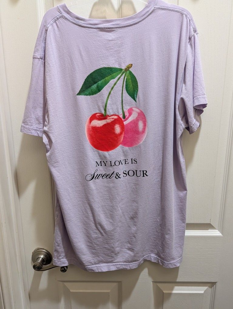Cute PINK Victoria's Secret t-shirt. Lavender color. Size Small. Has a small cherry graphic on the front and a bigger cherry graphic on the back with 'MY LOVE IS Sweet & SOUR' text. Super comfy tee. Considered oversized style perfect for v day