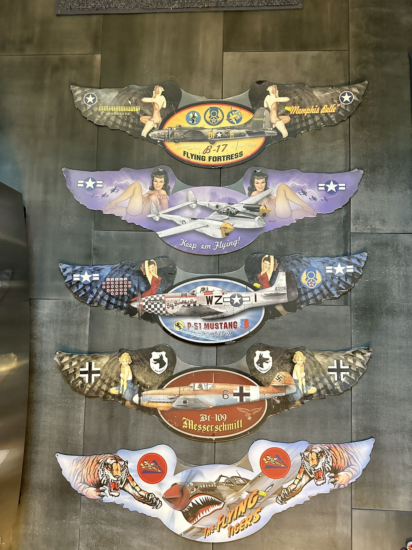 WWll memorabilia pin up girl metal wall art. Add a touch of vintage charm to your decor with this WWll Memorabilia Pin Up Girl Metal Wall Art collection. Inspired by classic advertising signs, this reproduction piece captures the essence of a bygone era. Perfect for collectors and enthusiasts of retro aesthetics, the wall art brings a nostalgic vibe to any room. Crafted with attention to detail, this metal artwork is designed to provide a timeless appeal. Whether it's for your home, garage, or man cave, this pin-up girl sign is sure to be a conversation starter. It's not just a piece of art; it's a slice of history that celebrates the iconic advertising style of the past. Asking $125 for all