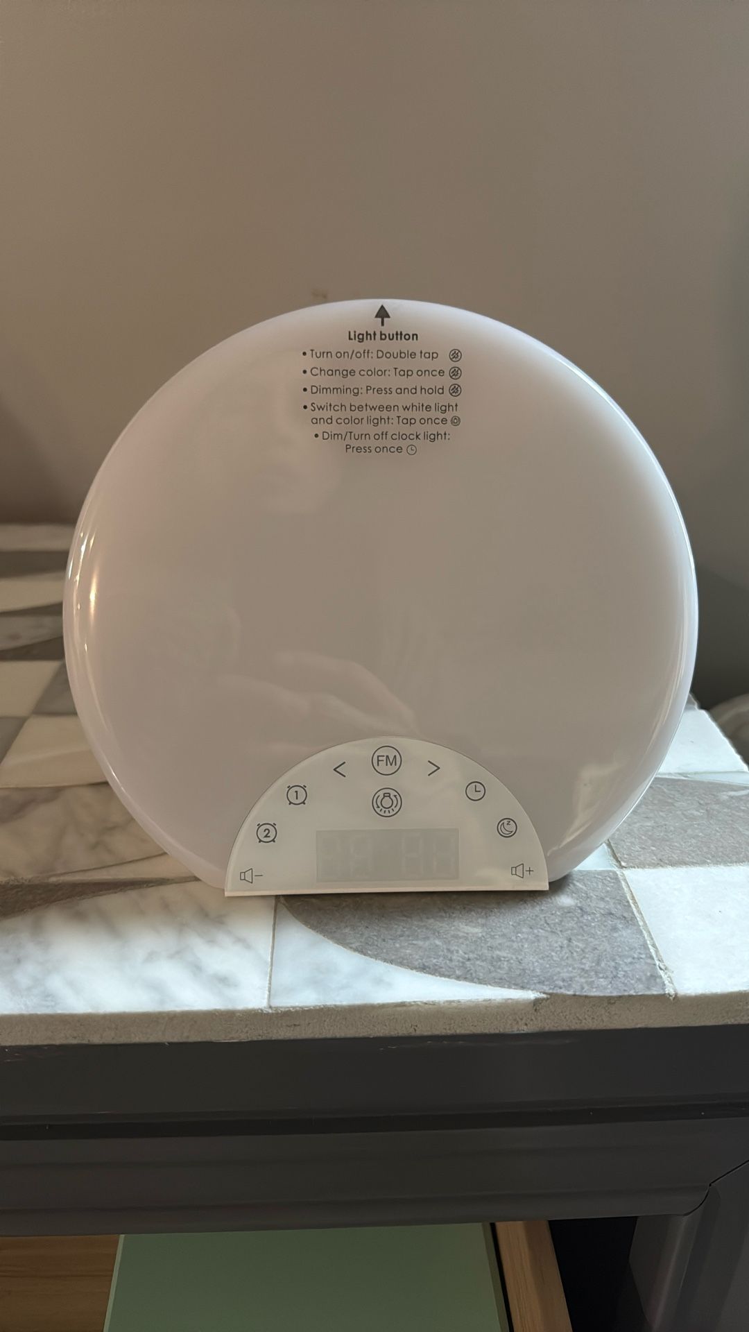 Wake up light alarm New /no box / never used Light button • Turn on/off: Double tap • Change color: Tapionce • Dimming: Press and hold, • Switch between white light and color light: Tap once o • Dim/Turn off clock light