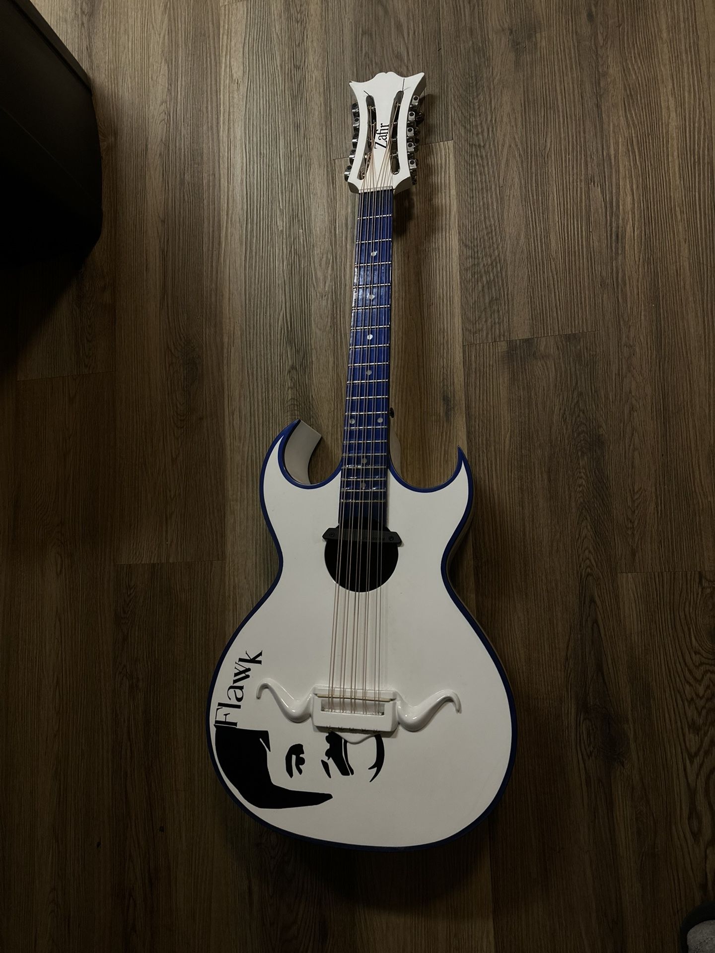 Glossy White and blue bajoquinto amazing sound and quality Can remove decal before purchasing Fisherman pick up installed Con estuche/case Elixir strings Willing to trade for other bajoquinto/bass/takamine