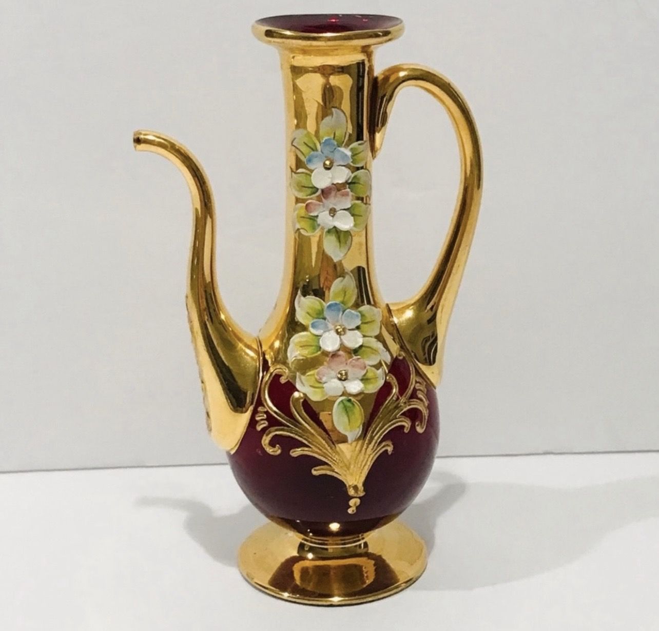 TreFuochi Venice Murano Glass Small Pitcher Red Ruby Gold 24K 5” Tall. Beautiful decorative pitcher with Enameled flowers is in very good condition.